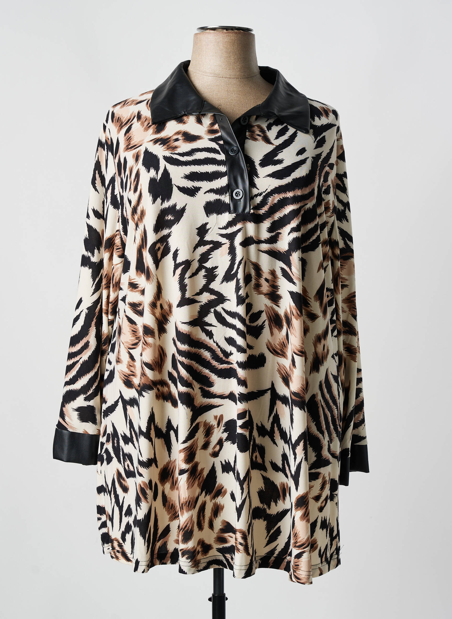 Laissez rugir votre style avec cette tunique manches longues signée 2W PARIS qui allie audace et élégance. Son imprimé animalier mêle des nuances de noir, beige et caramel dans un motif dynamique qui attire instantanément le regard, tandis que son col à pointe et ses poignets contrastés en noir apportent une touche de sophistication discrète. Sa coupe fluide et légèrement évasée promet un confort optimal tout en soulignant une silhouette féminine et moderne, idéale pour affirmer une allure chic sans effort.