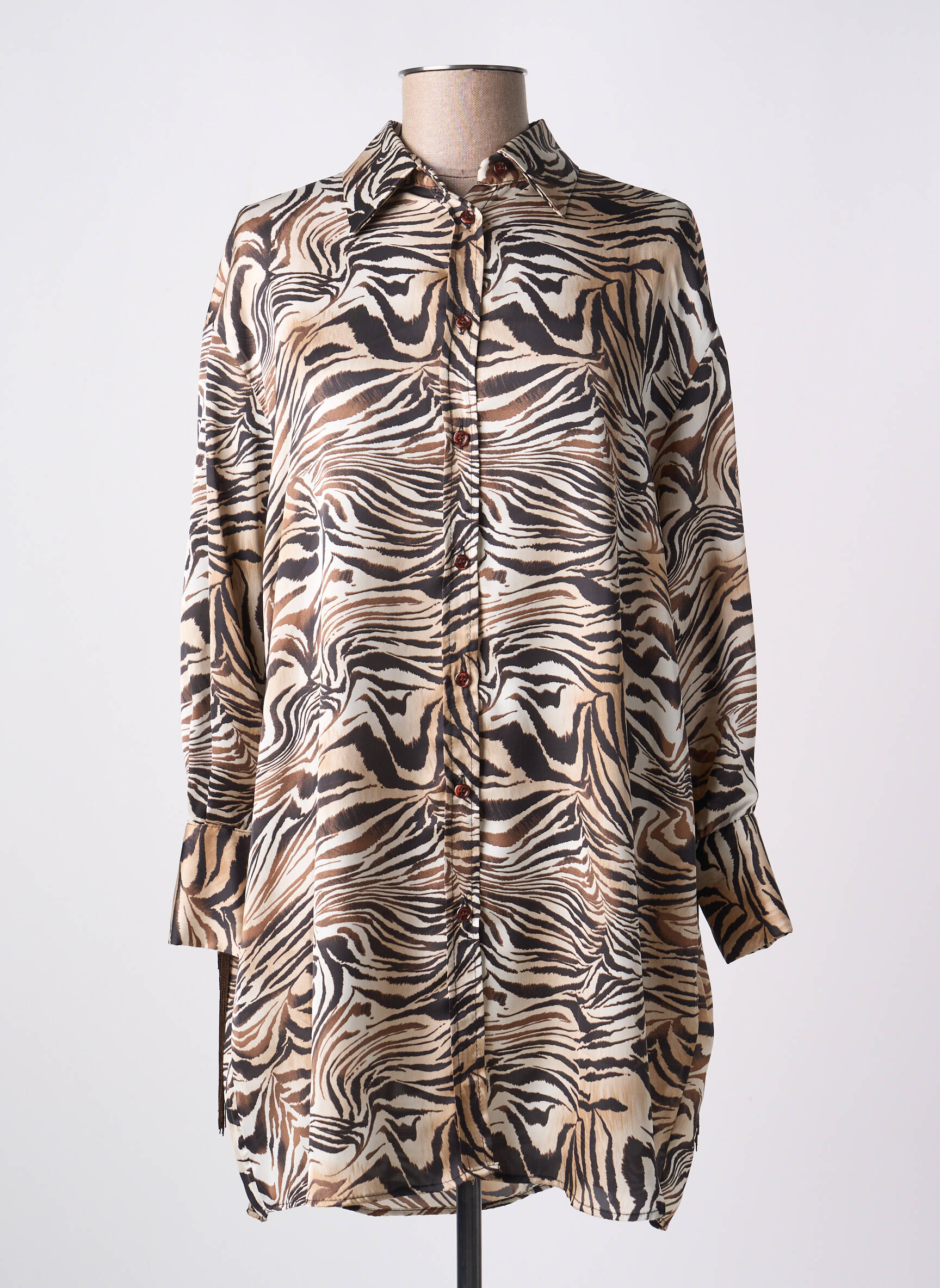 Plongez dans un univers sauvage avec la tunique à manches longues de la marque ANGELA DAVIS, une pièce qui associe audace et élégance. Son imprimé zébré captivant danse entre des nuances de beige, noir et caramel, attirant tous les regards. La coupe ample et fluide de cette tunique offre un confort optimal tout en permettant une grande liberté de mouvement. Dotée d'un col classique et de boutons sur toute la longueur, elle peut se porter seule pour un look décontracté ou s’accessoiriser pour une sortie plus habillée. Avec des manches ample et une longueur parfaite pour être associée à un pantalon ajusté ou un legging, cette pièce devient rapidement un essentiel de votre garde-robe.