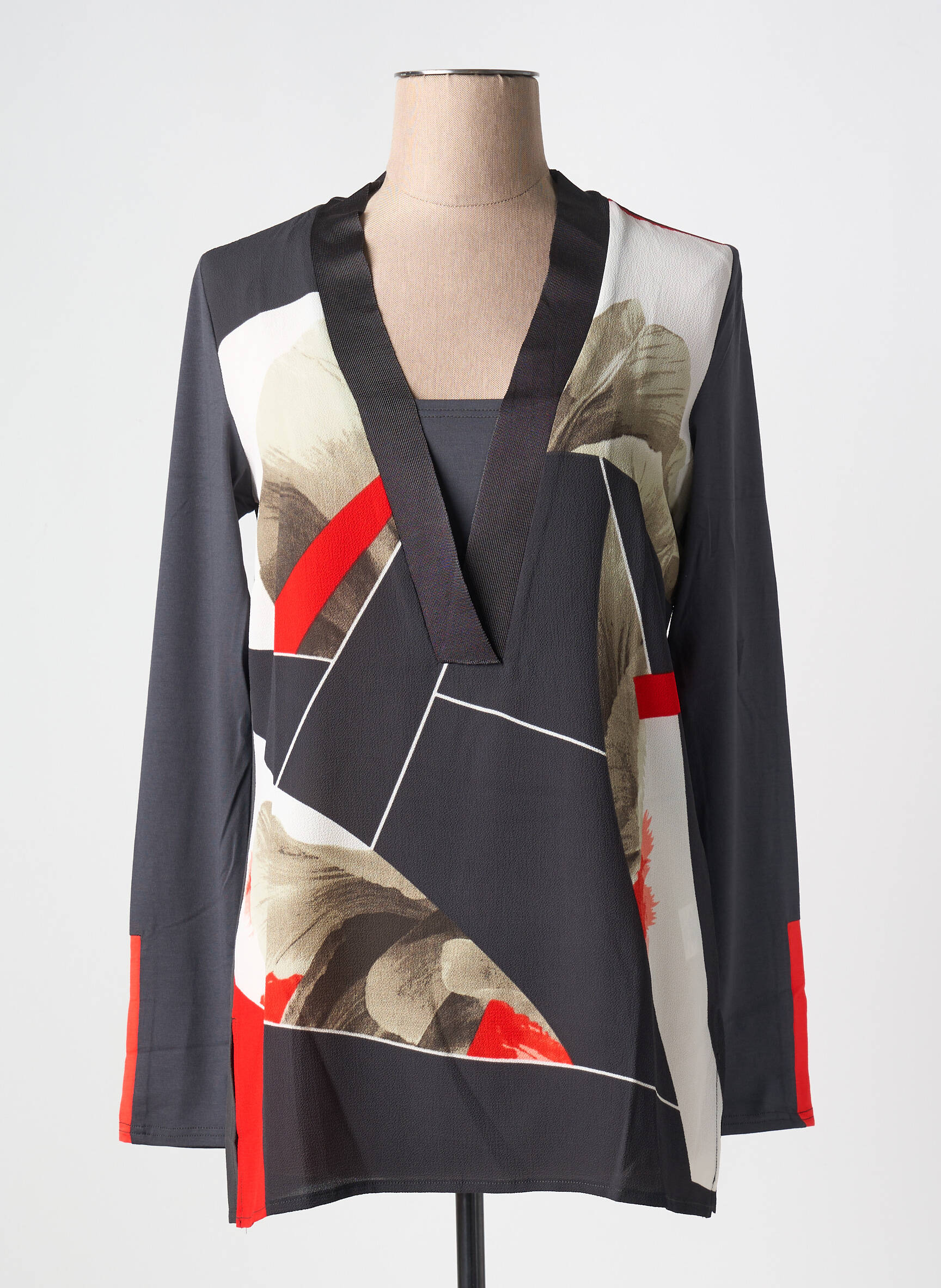 Profitez d’une véritable affaire avec cette tunique manches longues pour femme signée CAPTAIN TORTUE, idéale pour donner un coup de pep’s à votre dressing sans vous ruiner. Son col en V profond bordé d’un liseré satiné noir apporte une touche sophistiquée, tandis que le motif graphique mêlant noir, beige, blanc et rouge affirme votre style avec modernité. Cette pièce originale est parfaite pour celles qui aiment se démarquer à petit prix, tout en misant sur le confort et l’élégance au quotidien.