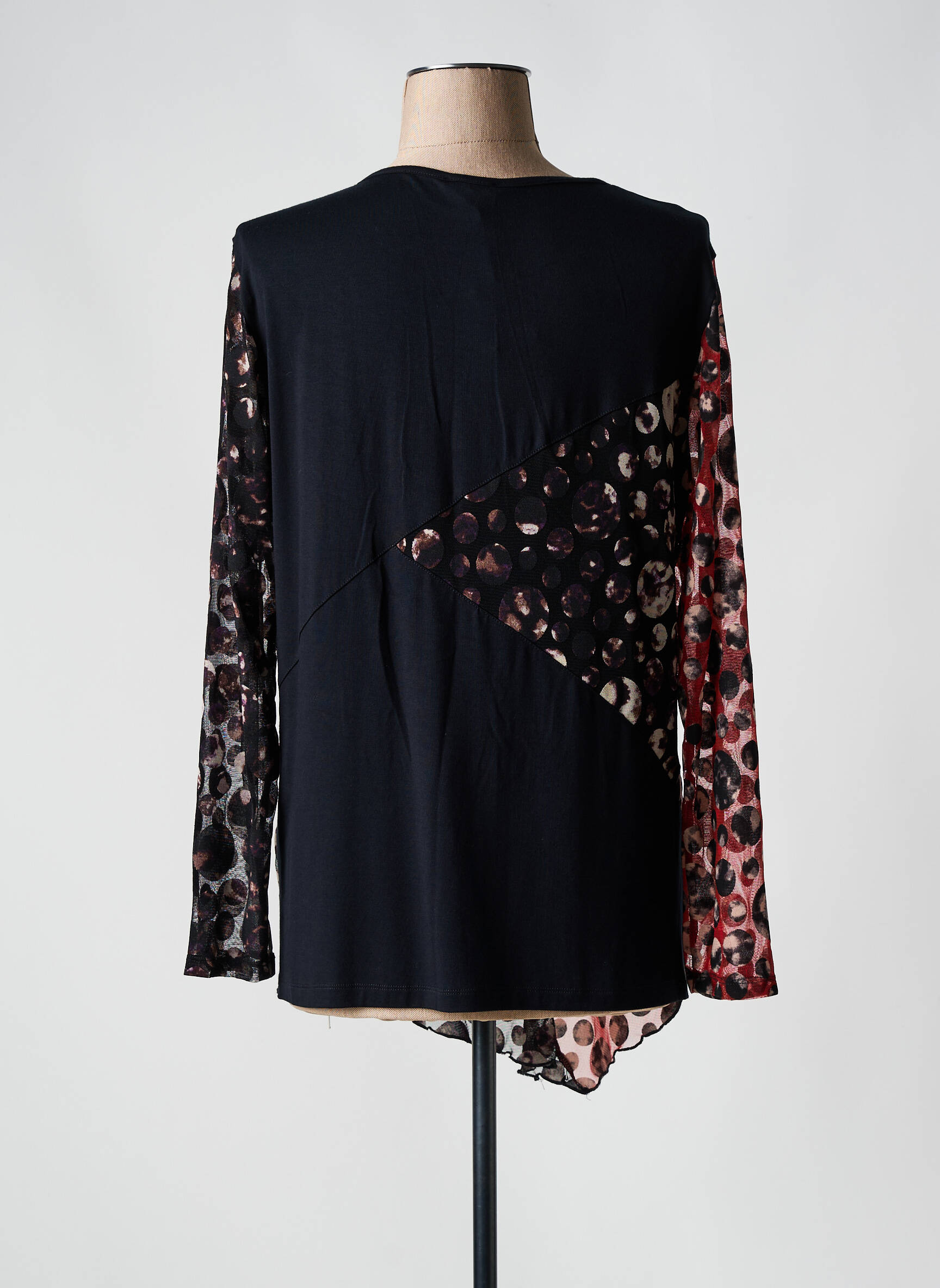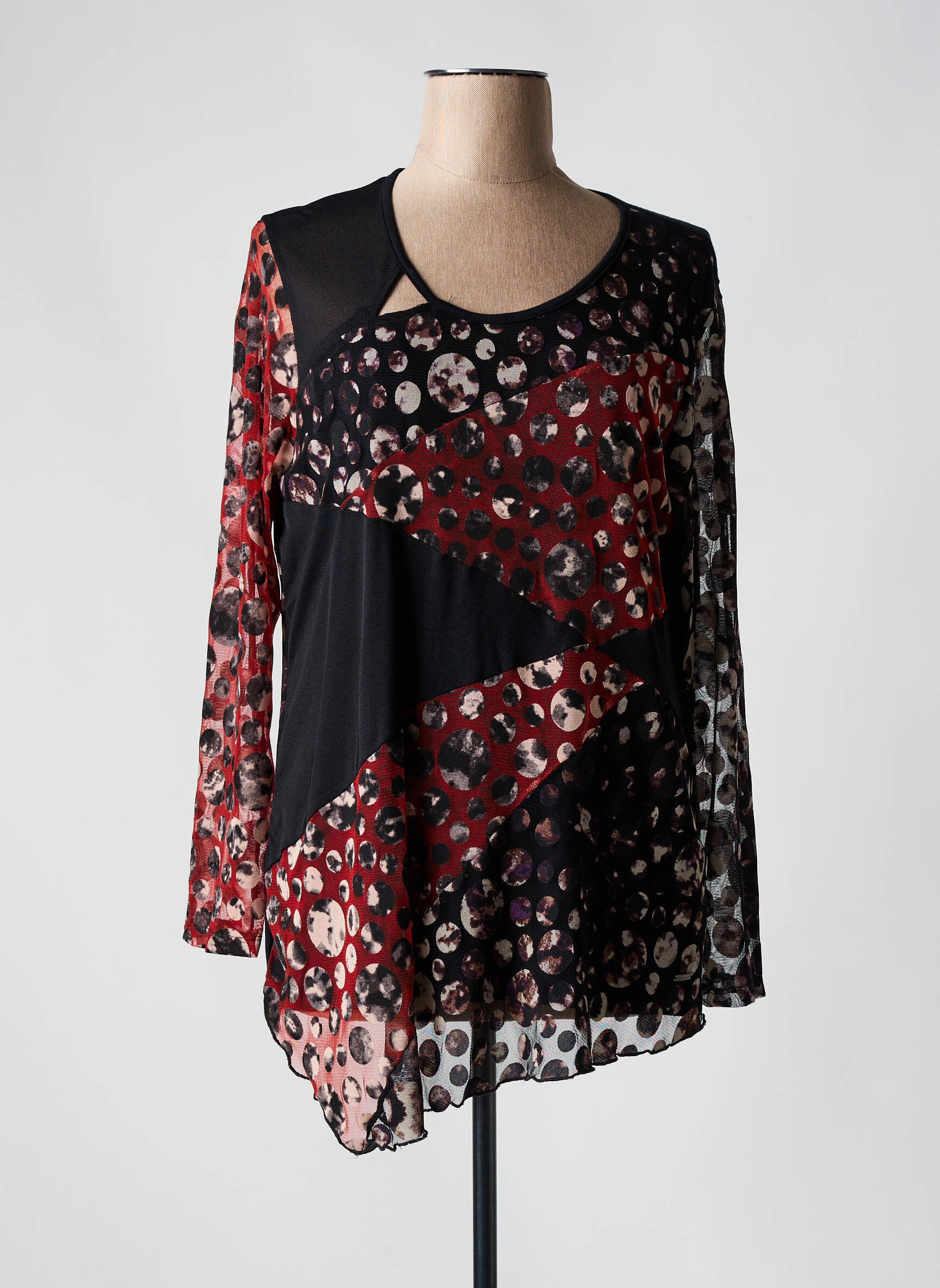 Profitez d’un vrai bon plan mode avec cette tunique manches longues FELINO pour femme, parfaite pour allier originalité et petit prix. Son imprimé mêlant des motifs ronds subtils dans des tons de rouge, noir et beige, rehaussé d’un jeu d’empiècements asymétriques, apporte du cachet instantané à votre look. Sa coupe fluide et son encolure dégagée assurent un confort au quotidien, idéale pour moderniser votre garde-robe sans se ruiner.