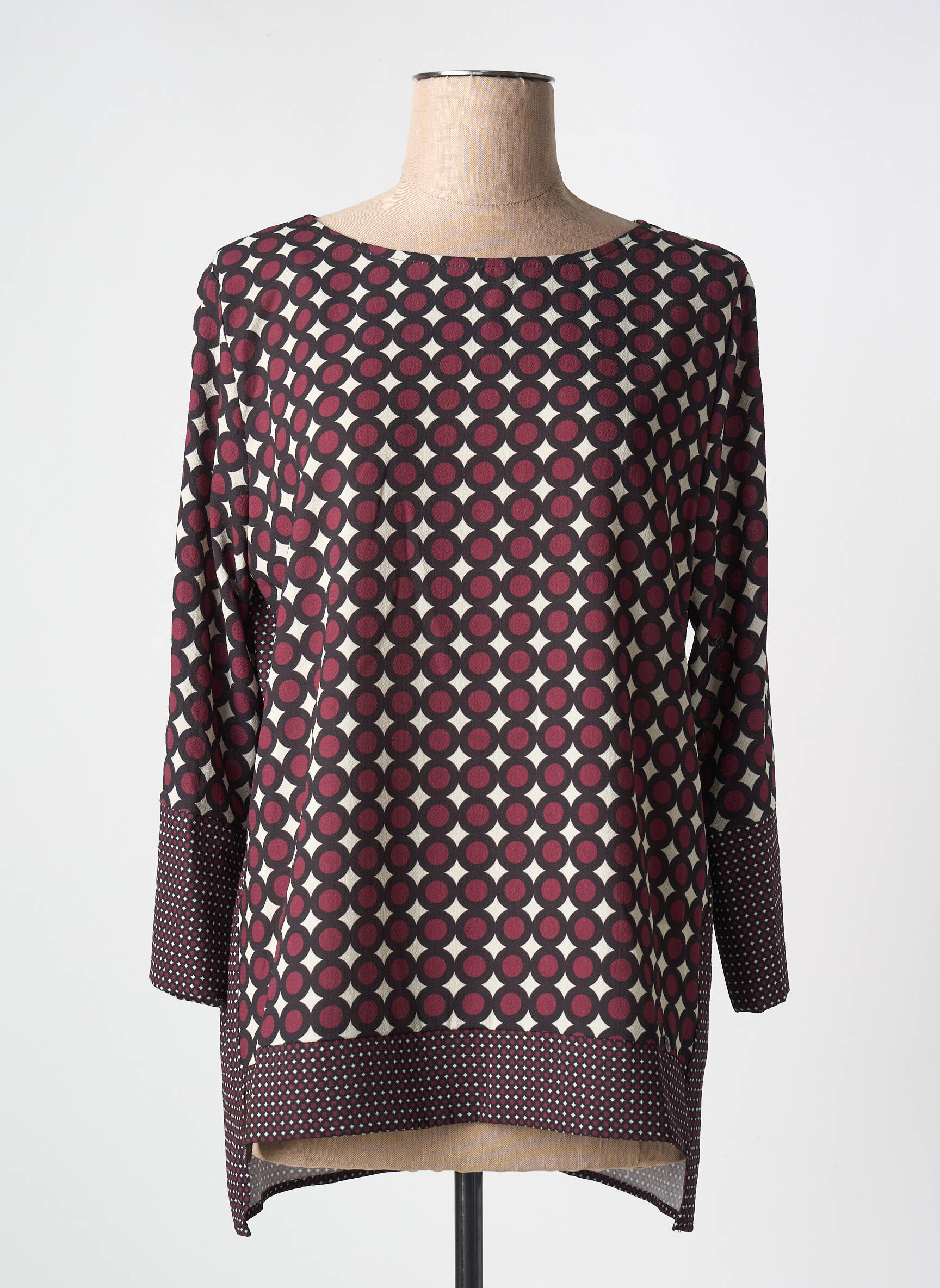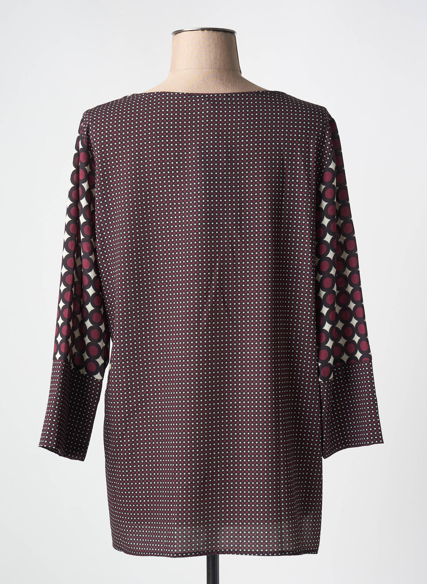 Profitez d'une vraie bonne affaire avec cette tunique manches longues FRED SABATIER pour femme qui séduit par son motif graphique original dans des tons bordeaux et écru, rehaussé de jolis détails contrastés aux poignets et à la base. Avec sa coupe souple et son col rond, elle assure un style à la fois moderne et confortable, parfait pour renouveler votre garde-robe à petit prix. C'est le choix idéal pour apporter une touche tendance à vos tenues sans vous ruiner.