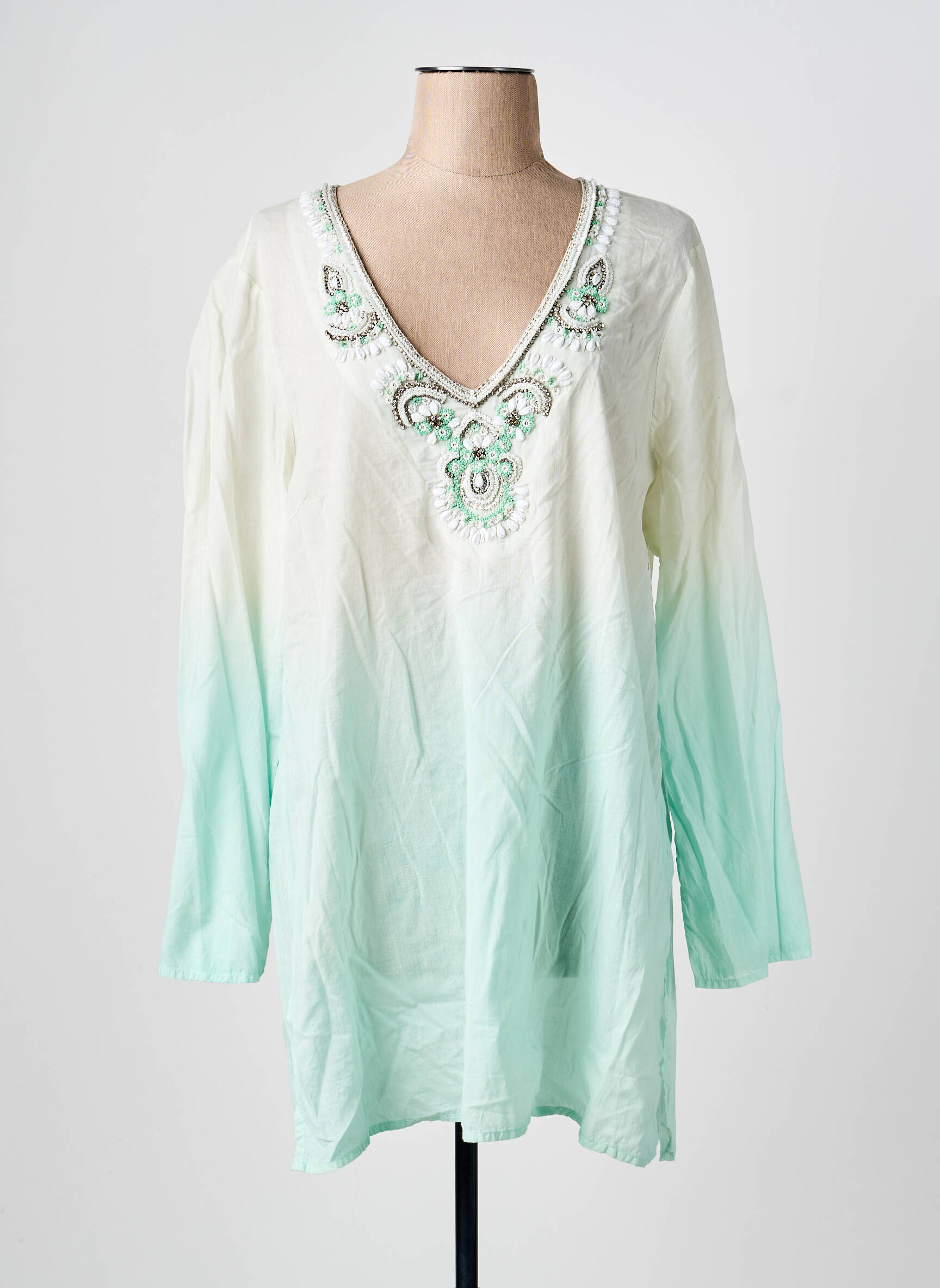 Craquez pour cette tunique manches longues MALVIN à prix mini, une véritable aubaine pour donner du style à votre garde-robe sans vous ruiner. Son dégradé de blanc cassé vers un vert d’eau très doux apporte une touche fraîche et estivale, tandis que le col en V orné de broderies et de perles ajoute une note raffinée et féminine. Ce modèle léger est idéal pour apporter élégance et confort à votre quotidien ou pour compléter une tenue de vacances à petit prix.