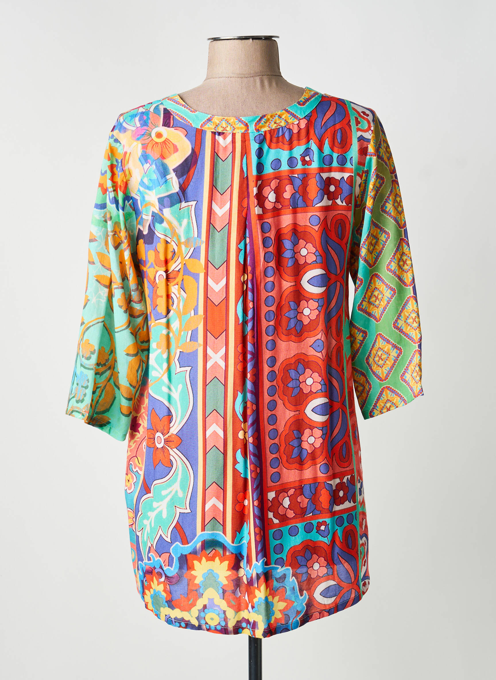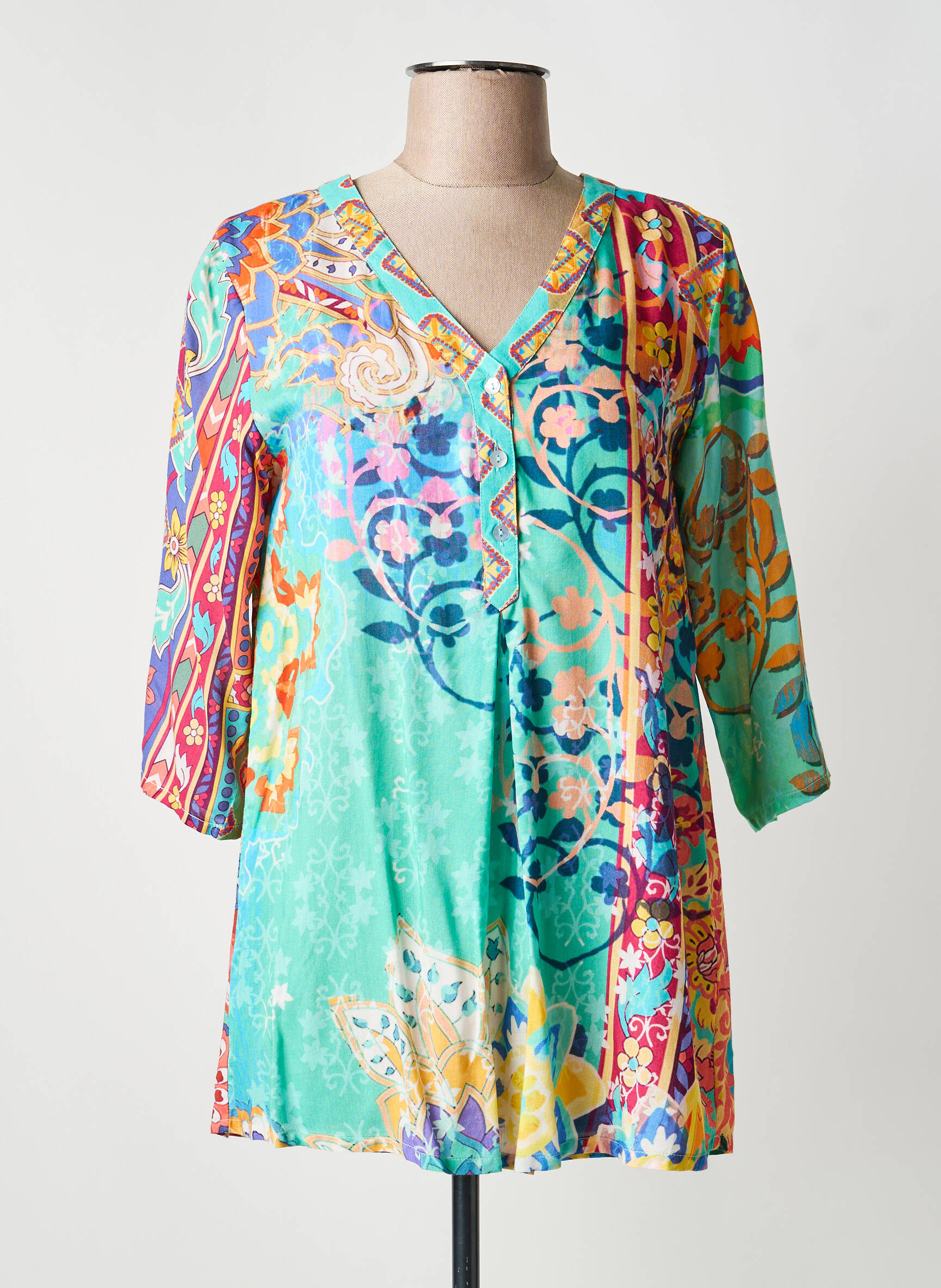 Profitez d’une vraie affaire avec cette tunique manches longues de la marque Orientique Naturally, idéale pour apporter une touche d’originalité à votre dressing sans vous ruiner. Son imprimé floral multicolore sur fond bleu turquoise, rehaussé de touches jaune, orange et fuchsia, lui donne une allure vive et joyeuse, parfaite pour illuminer vos journées tout en restant confortable et féminine grâce à sa coupe fluide et son col en V élégant. Faites-vous plaisir à petit prix avec un modèle unique qui attire tous les regards.