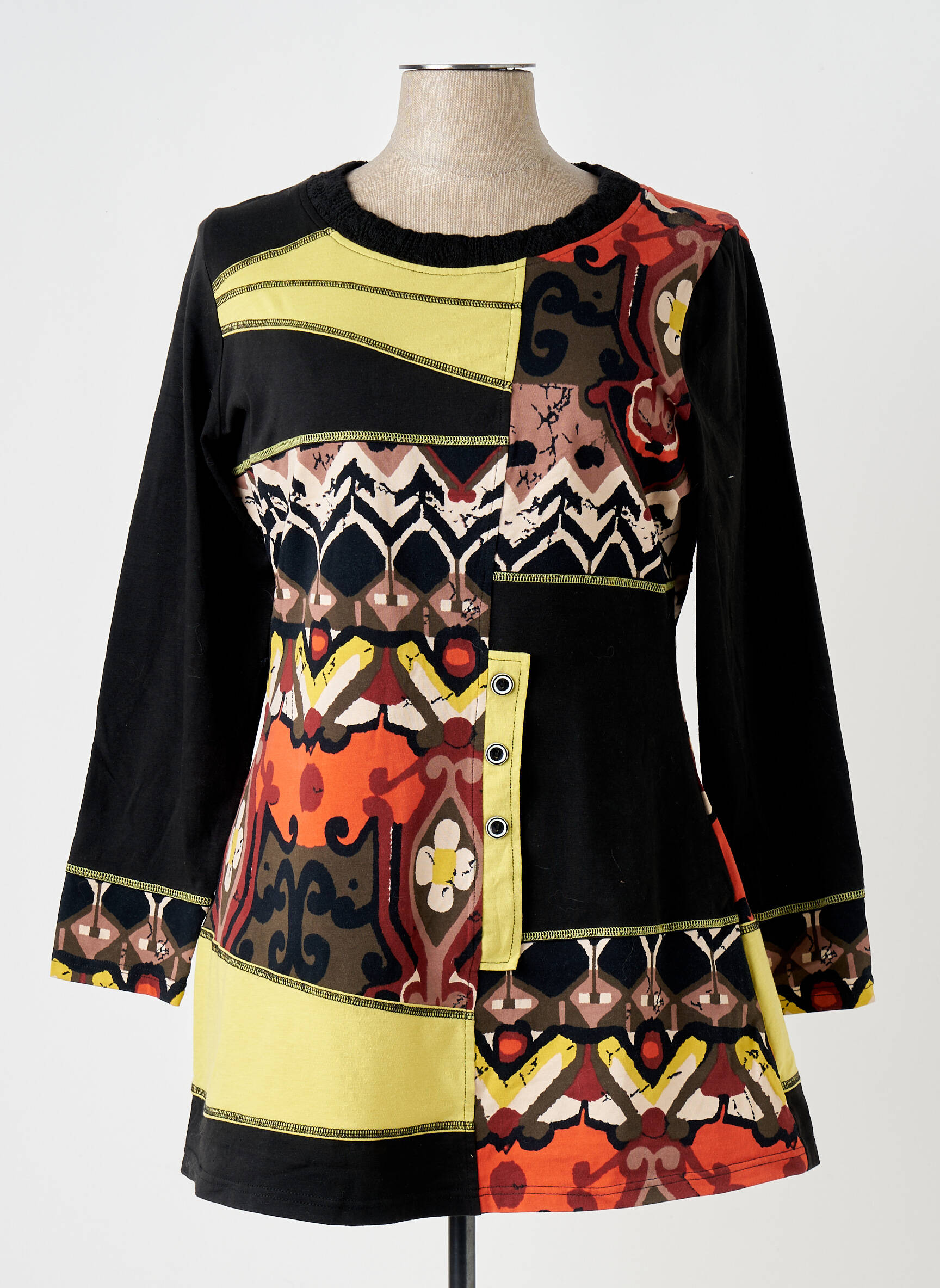 Cette tunique se porte facilement avec un legging noir ou un jean slim pour mettre en valeur ses motifs et ses couleurs. Pour un style décontracté, elle s’accorde parfaitement avec des bottines ou des baskets unies, mais elle peut aussi être glissée sous une veste en cuir ou un gilet long pour donner du pep’s à une tenue de mi-saison. Quelques accessoires discrets comme une paire de boucles d’oreilles dorées ou un sac bandoulière uni viendront compléter le look tout en laissant la place à l’originalité de la tunique.
