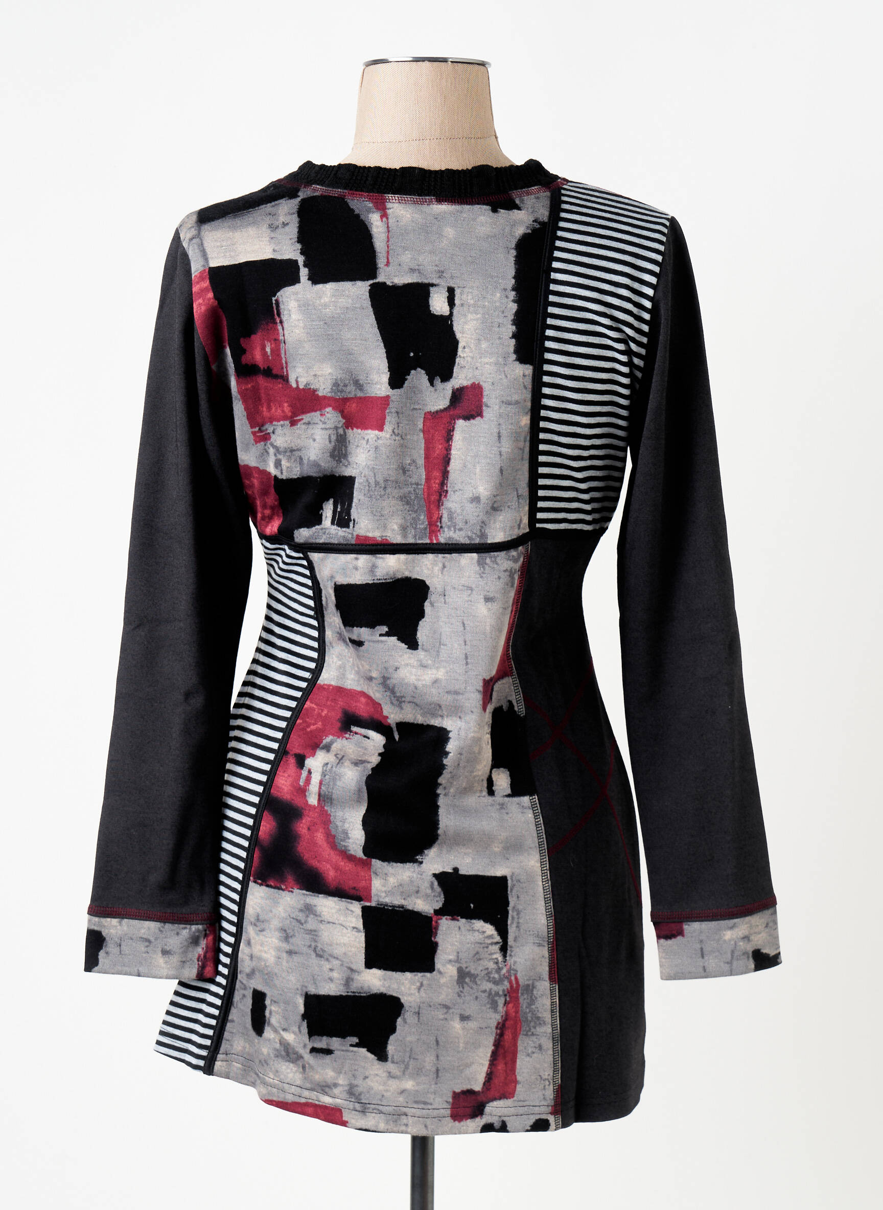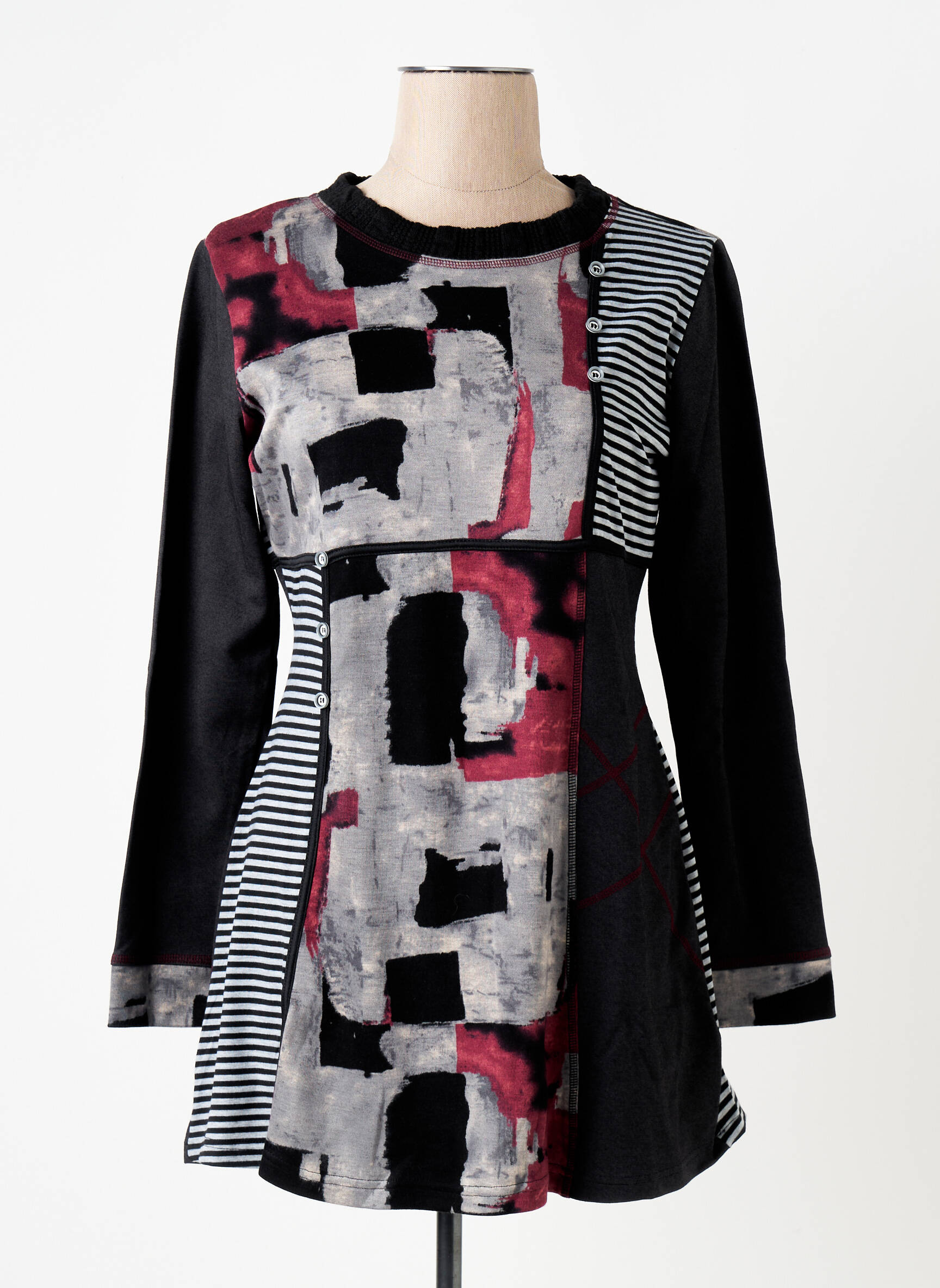 Craquez pour cette tunique manches longues S.QUISE pour femme, un vrai bon plan pour adopter un look original sans vous ruiner. Avec son motif graphique audacieux mêlant noir, rouge et gris, elle affiche une touche artistique et moderne, tandis que les bandes rayées latérales ajoutent une note dynamique à la silhouette. Idéale pour celles qui aiment se démarquer au quotidien, cette pièce abordable est parfaite pour renouveler votre dressing à prix doux tout en profitant d’un style unique.