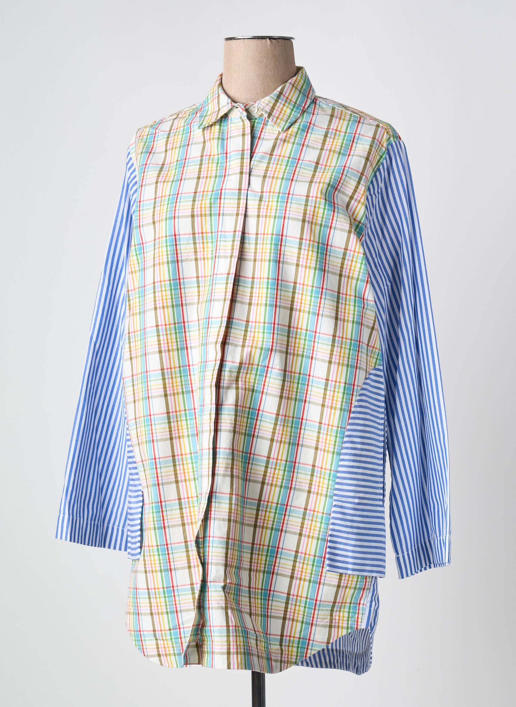 Saisissez l’occasion de vous offrir une pièce unique à prix mini avec cette tunique manches longues signée V.DE.VINSTER pour femme, qui combine avec audace un devant à carreaux multicolores et des manches rayées bleues pour un look à la fois moderne et original. Son col chemise et sa coupe légèrement oversize ajoutent une touche de décontraction tout en gardant une allure tendance, parfait pour dynamiser votre dressing sans vous ruiner.