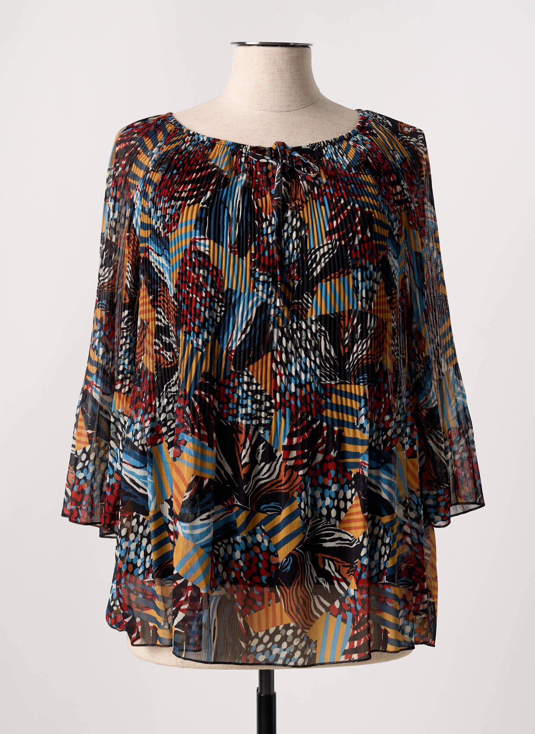 Pour un look réussi, cette tunique se marie parfaitement avec un pantalon slim uni ou un jean foncé afin de mettre en valeur ses motifs colorés. Tu peux l’agrémenter d’une ceinture fine à la taille pour structurer la silhouette, ou la laisser fluide pour un style plus bohème. Des accessoires dorés apportent une touche de chic, tandis qu’un sac en bandoulière et des boots complètent une tenue tendance et confortable à petit prix.