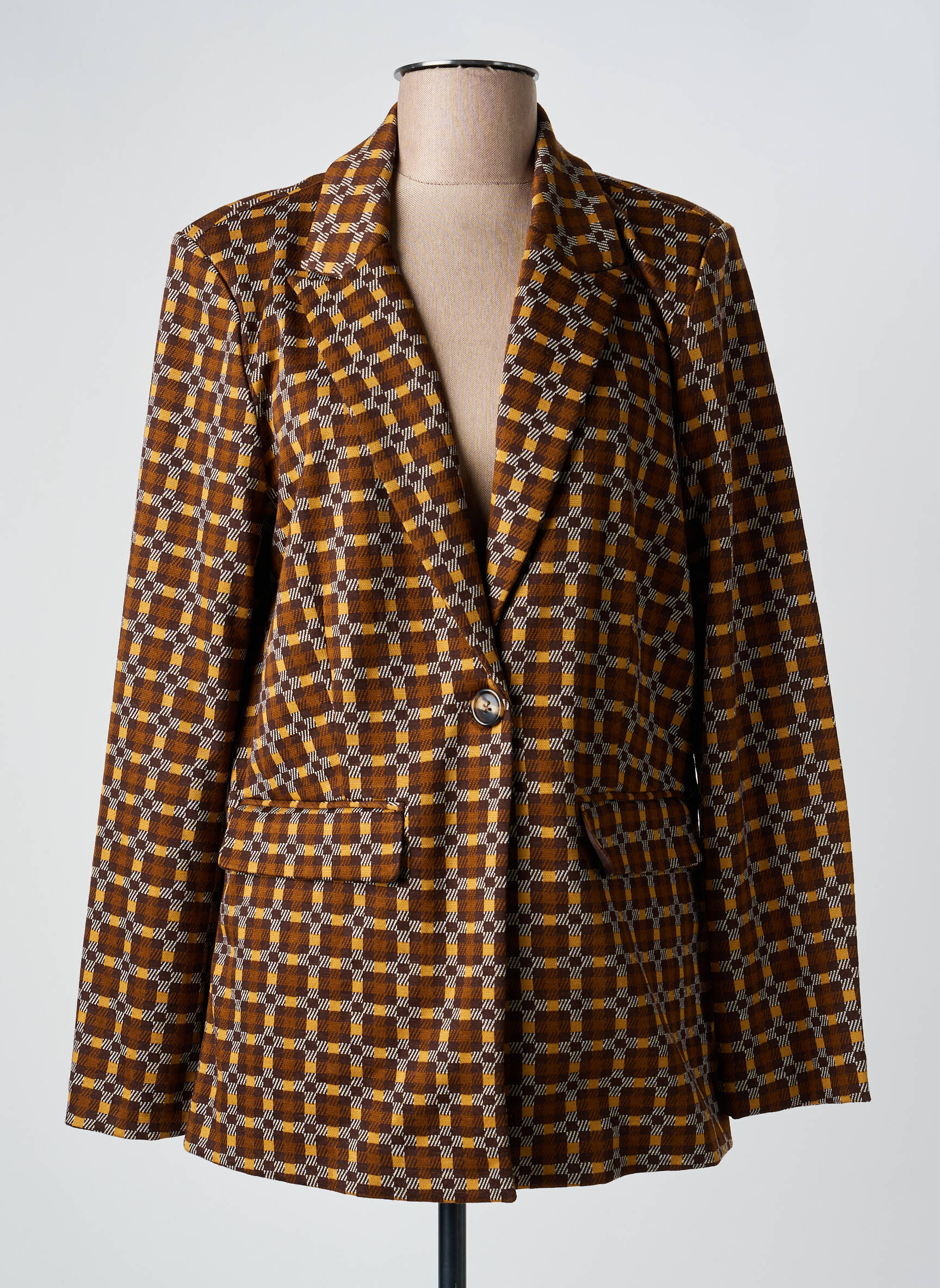 Craquez pour ce blazer B.YOUNG pour femme et donnez du style à vos tenues sans vous ruiner grâce à ce bon plan mode. Ce modèle séduit par sa coupe classique réhaussée d’un motif graphique rétro dans les tons moutarde et bleu, parfait pour apporter une touche d’originalité à vos looks du quotidien. Sa fermeture par un bouton unique à l’avant et ses poches discrètes lui confèrent une allure à la fois élégante et pratique, idéale pour celles qui veulent rester tendance tout en faisant des économies.