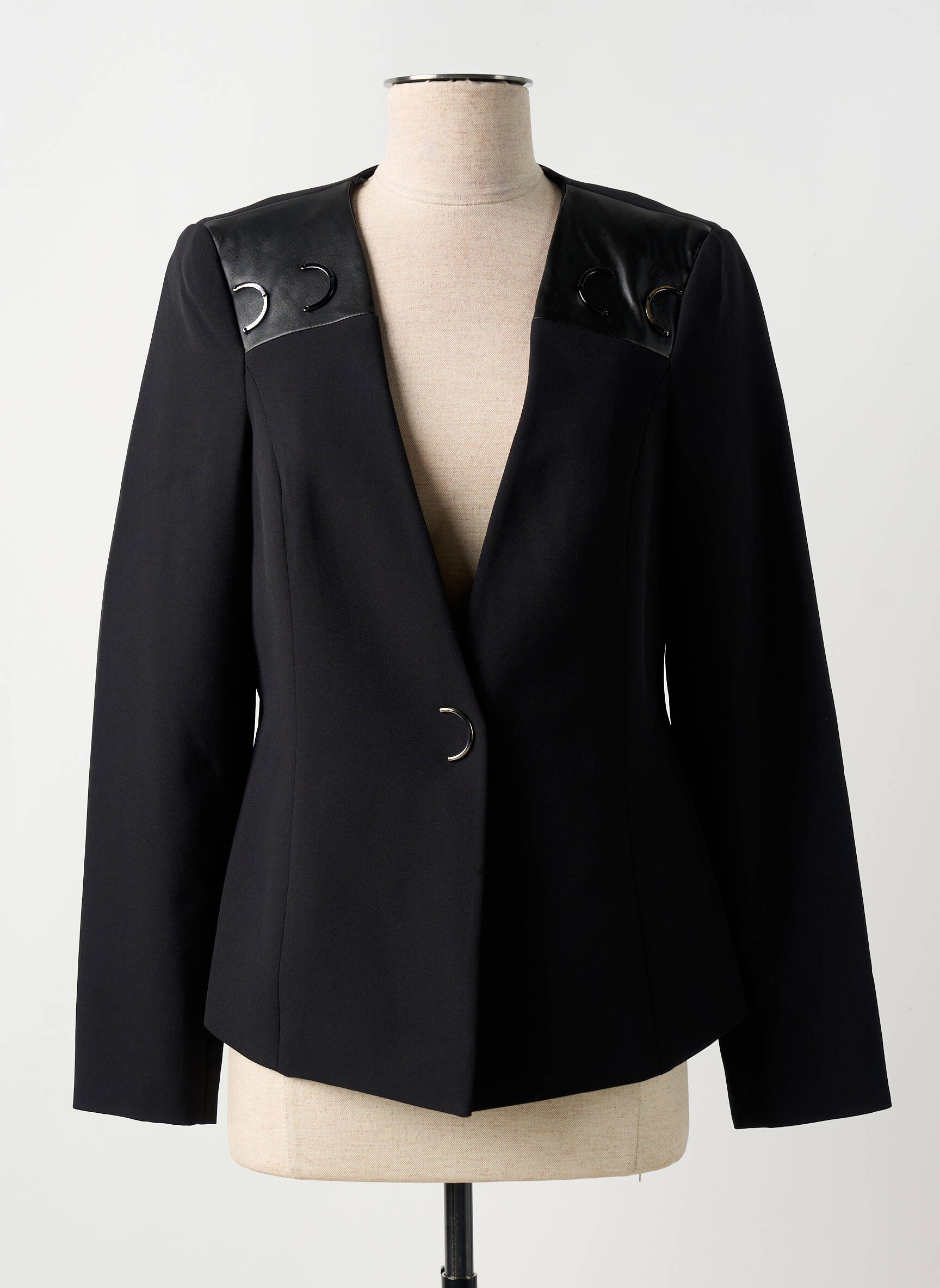 Craquez pour ce blazer femme signé Gregory Pat, une vraie aubaine pour apporter une touche chic et tendance à votre dressing sans vous ruiner. Son coloris noir intemporel est rehaussé d’élégants empiècements effet cuir aux épaules, qui ajoutent une note moderne et sophistiquée. Sa coupe structurée et sa fermeture devant par un bouton métal discret assurent silhouette flatteuse et allure professionnelle, tout en permettant de le porter aussi bien en journée qu’en soirée. À ce prix mini, inutile d’hésiter pour se faire plaisir et moderniser sa garde-robe avec classe.