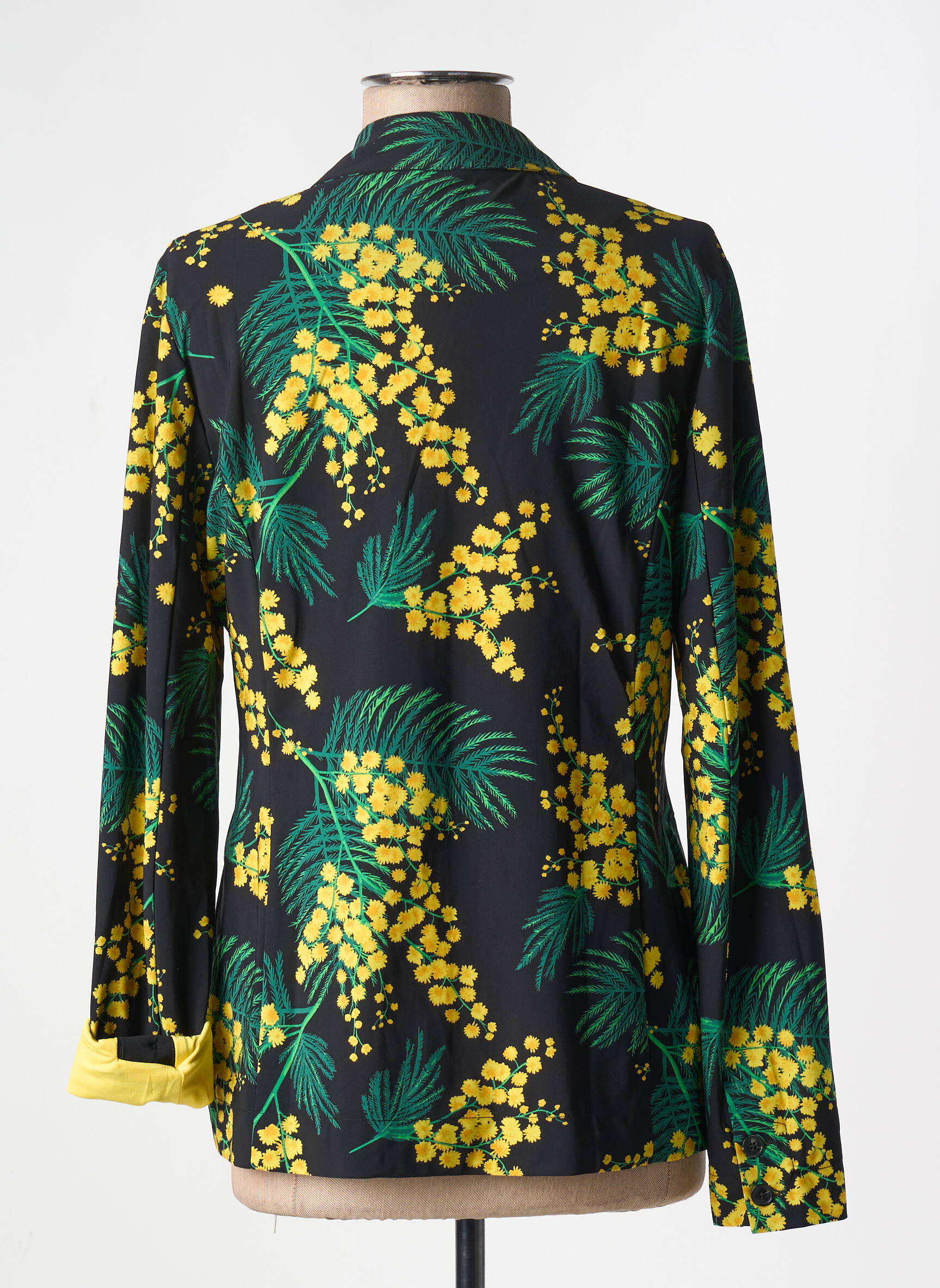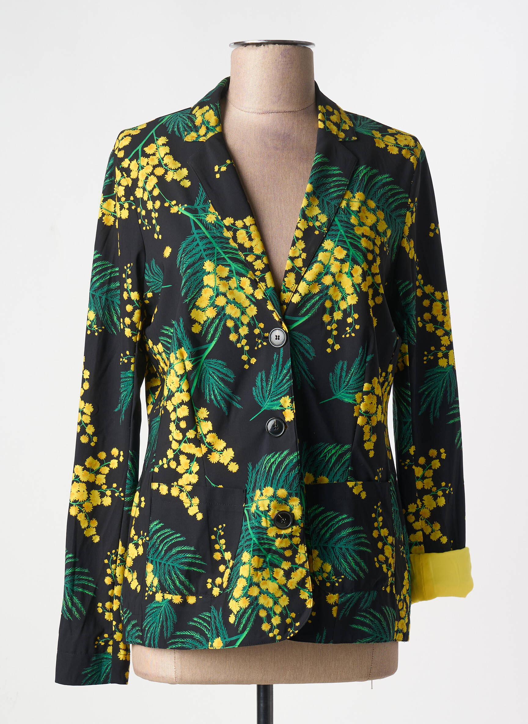 Profitez d'une belle affaire avec ce blazer femme INDIES, proposé à prix mini, idéal pour dynamiser votre garde-robe sans vous ruiner. Son imprimé floral éclatant aux nuances de vert et de jaune sur fond noir apporte une vraie touche d’originalité, tandis que la coupe légèrement structurée souligne la silhouette. Parfait pour donner du peps à une tenue classique, il se distingue aussi par son revers de manches contrasté jaune qui offre une note de style supplémentaire à petit prix.