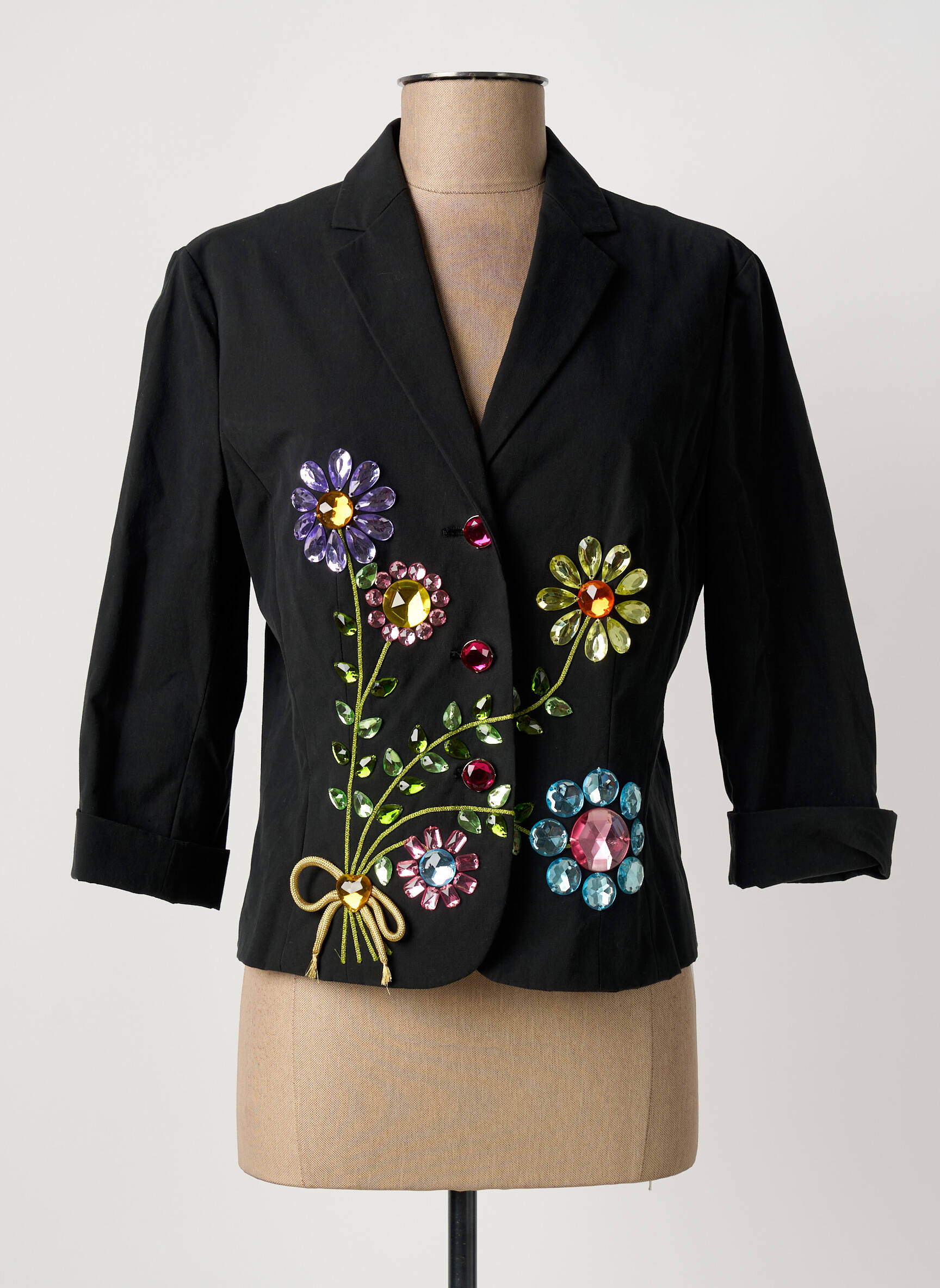 Ce blazer femme de la marque MOSCHINO est une véritable opportunité à saisir pour donner une touche de fantaisie à votre vestiaire sans vous ruiner. Sa coupe élégante et chic se distingue par de magnifiques broderies florales rehaussées de strass colorés, qui apportent modernité et originalité à ce classique revisité. Les manches trois-quarts et la matière légère mettent en valeur la silhouette tout en restant confortables, une pièce de créateur à prix mini qui illumine instantanément toutes vos tenues.