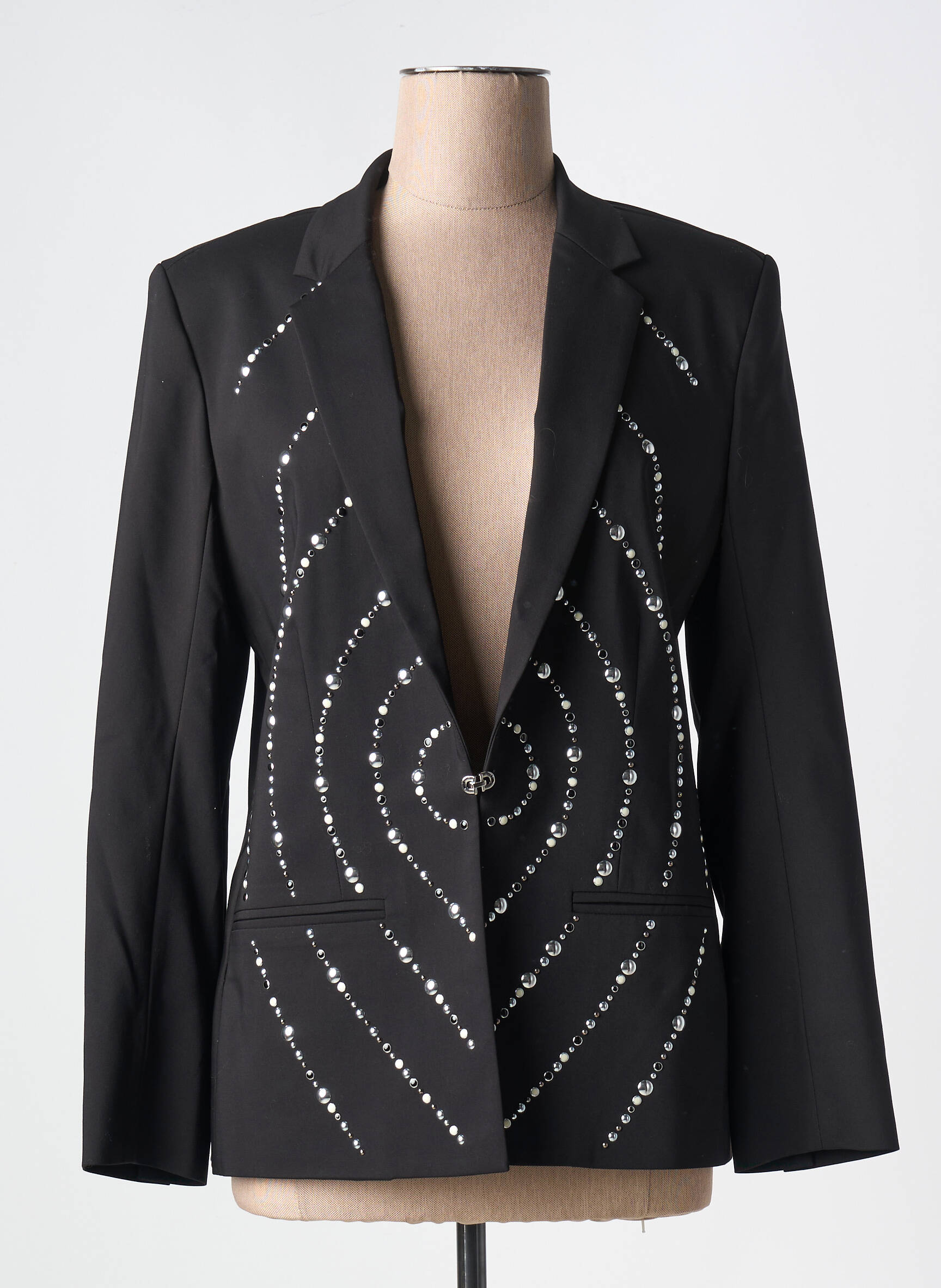 Craquez pour ce blazer femme signé NATHALIE CHAIZE à prix tout doux, une pièce chic et originale qui se distingue par ses lignes de strass disposées en motifs graphiques concentriques sur un fond noir élégant, parfait pour apporter une touche de modernité à toutes vos tenues sans vous ruiner.