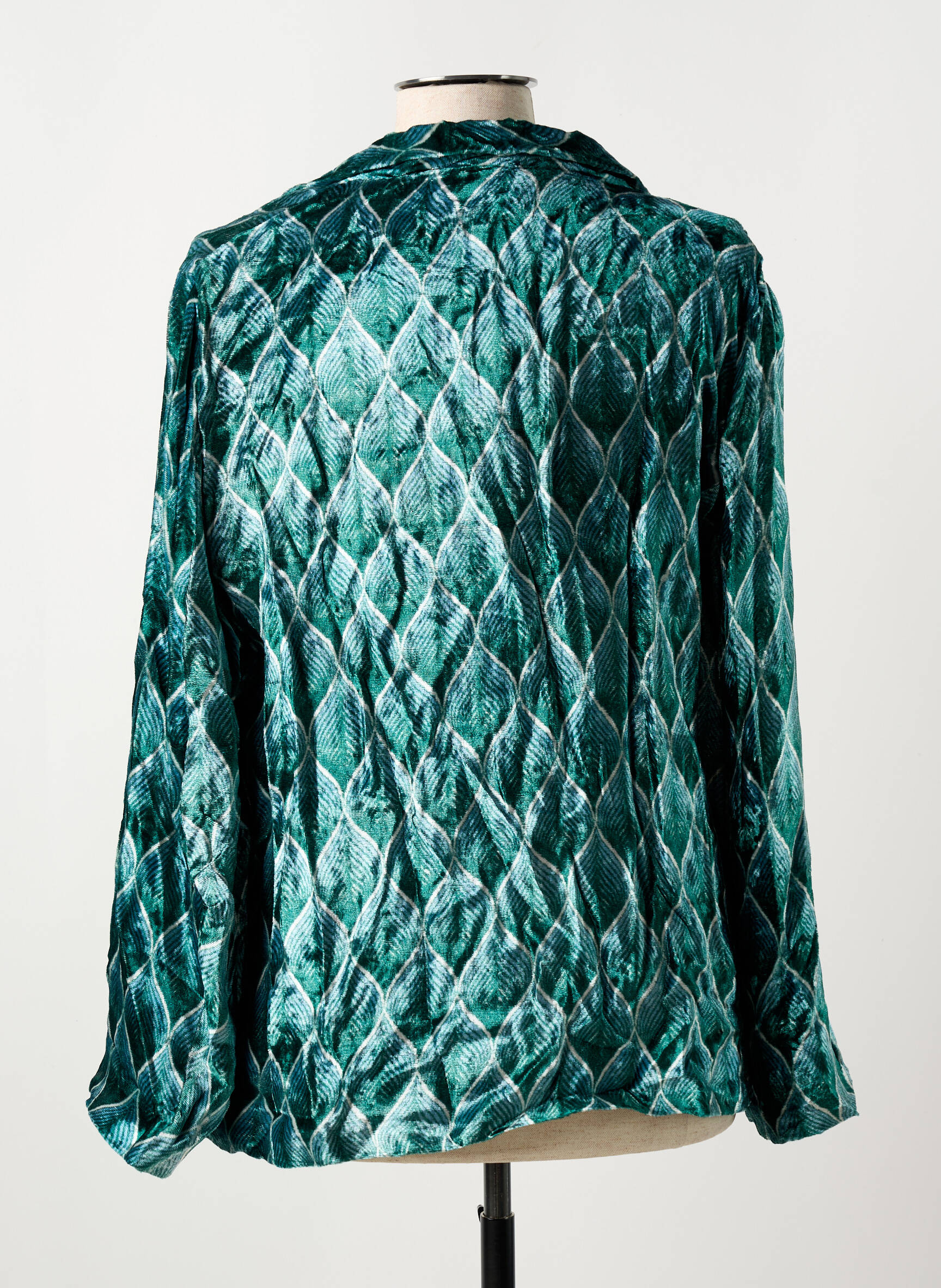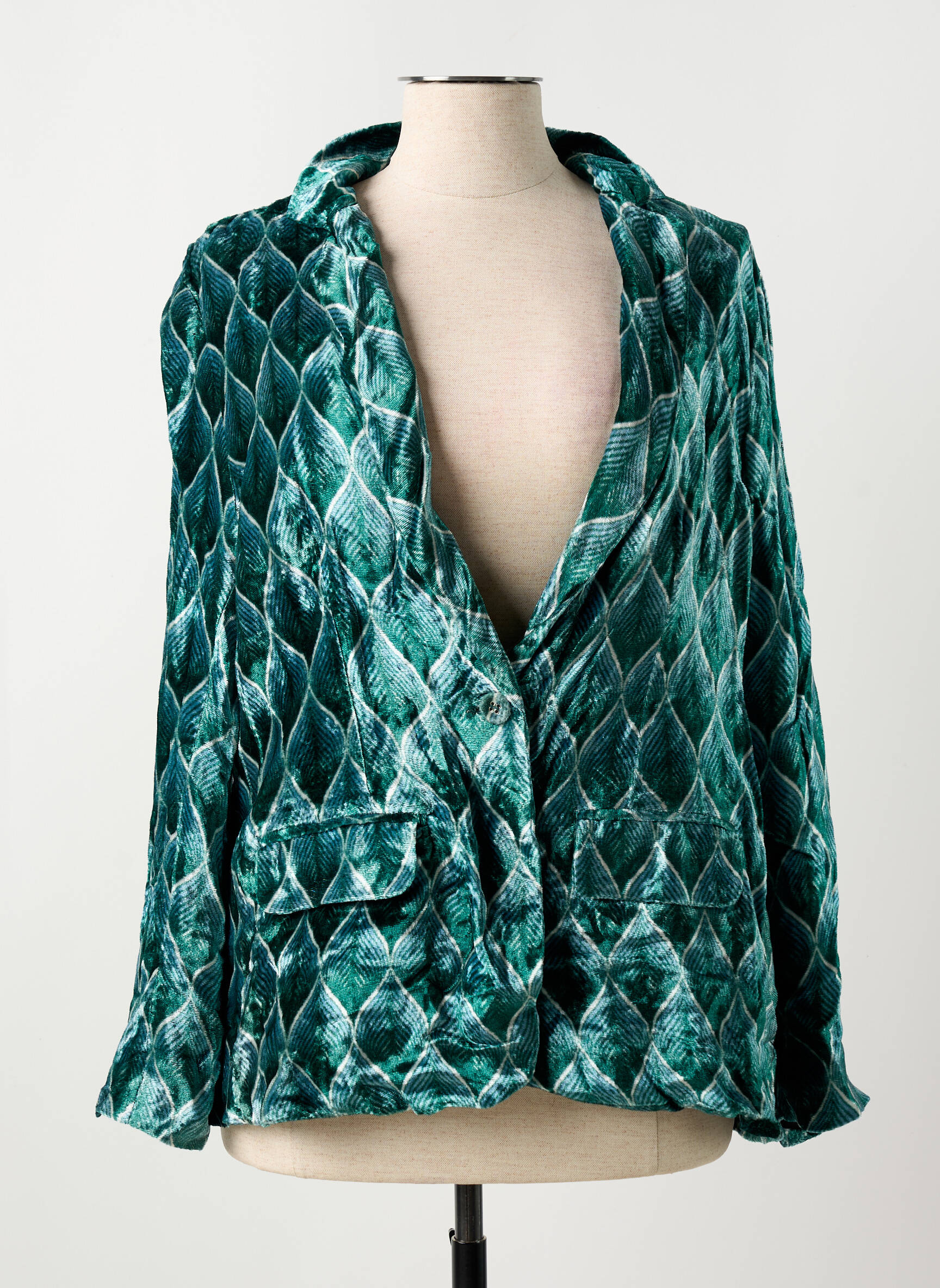 Craquez pour ce blazer unique de la marque STORIATIPIC à prix irrésistible, parfait pour celles qui veulent se faire plaisir sans compromis sur le style. Sa texture effet velours et son motif graphique dans des teintes vert émeraude apportent une touche d’originalité à toutes vos tenues, pour une allure élégante et moderne à petit prix. Saisissez l’opportunité de donner du caractère à votre garde-robe avec cette pièce de créateur disponible en déstockage.