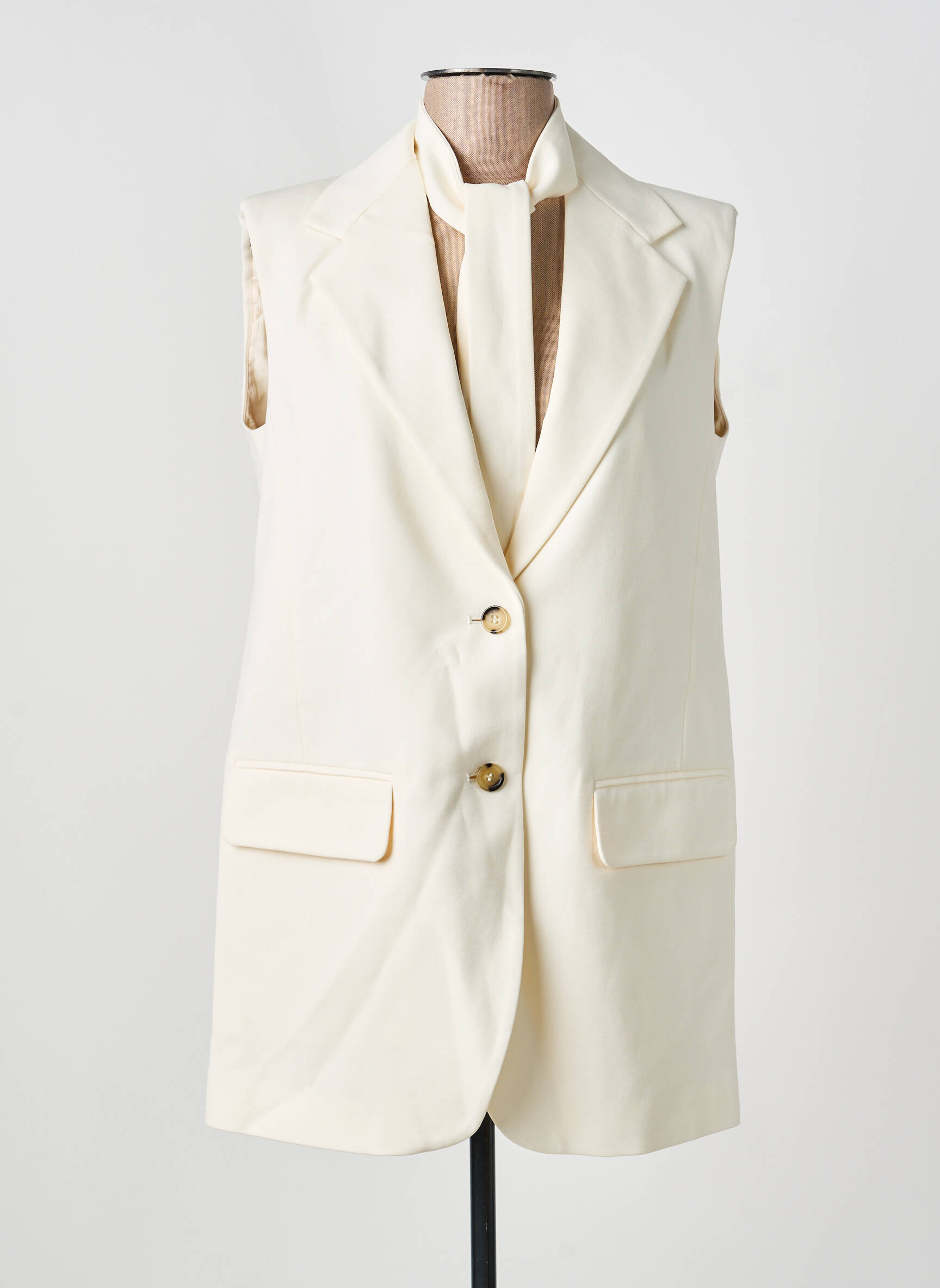 Profitez d’un bon plan mode en vous offrant ce blazer sans manches signé WEEKEND MAXMARA à prix réduit, idéal pour apporter une touche élégante et contemporaine à toutes vos tenues. Sa coupe droite et allongée flatte la silhouette tout en restant confortable, tandis que sa teinte crème lumineuse s’associe facilement à vos basiques du quotidien. Les détails raffinés comme les deux boutons dorés à l’avant et les poches à rabat ajoutent chic et praticité à ce modèle, parfait pour celles qui aiment la qualité à prix mini.