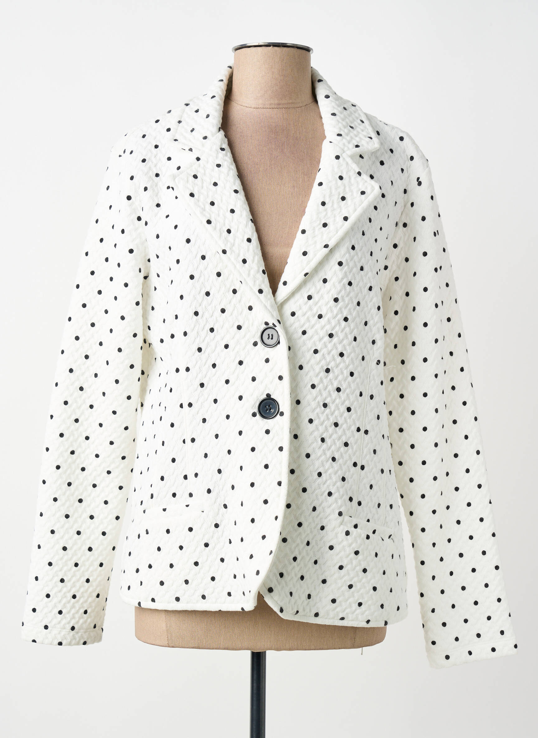 Craquez pour cette veste casual DOLCEZZA pour femme, l'occasion parfaite de s'offrir une pièce chic à prix mini. Son tissu blanc à imprimé pois noirs apporte une touche rétro et tendance, tandis que sa coupe légèrement cintrée avec un col tailleur et ses deux boutons assurent une silhouette élégante et féminine. C'est la veste idéale pour donner du style à vos looks du quotidien sans vous ruiner, une vraie bonne affaire à ne pas laisser passer.