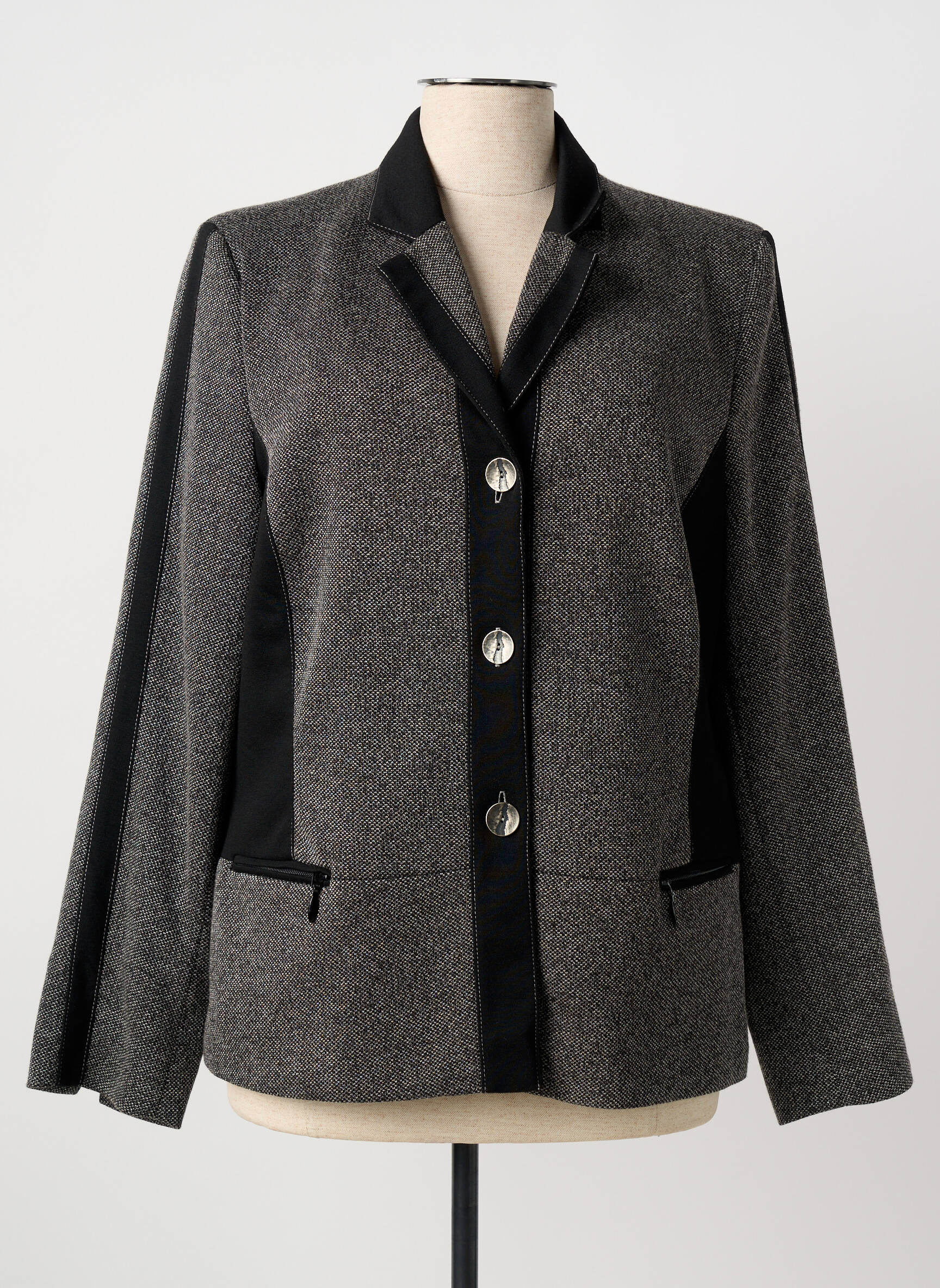 Craquez pour cette veste casual de la marque FRANCE RIVOIRE, une pièce élégante à prix mini pour compléter votre dressing sans vous ruiner. Sa coupe classique modernisée par des empiècements noirs sur les côtés et le col contraste subtilement avec le tissu gris chiné, tandis que les boutons décoratifs ajoutent une touche raffinée et tendance. Les poches discrètes soulignent son côté pratique et chic, idéale pour une allure soignée au quotidien tout en réalisant une vraie bonne affaire.