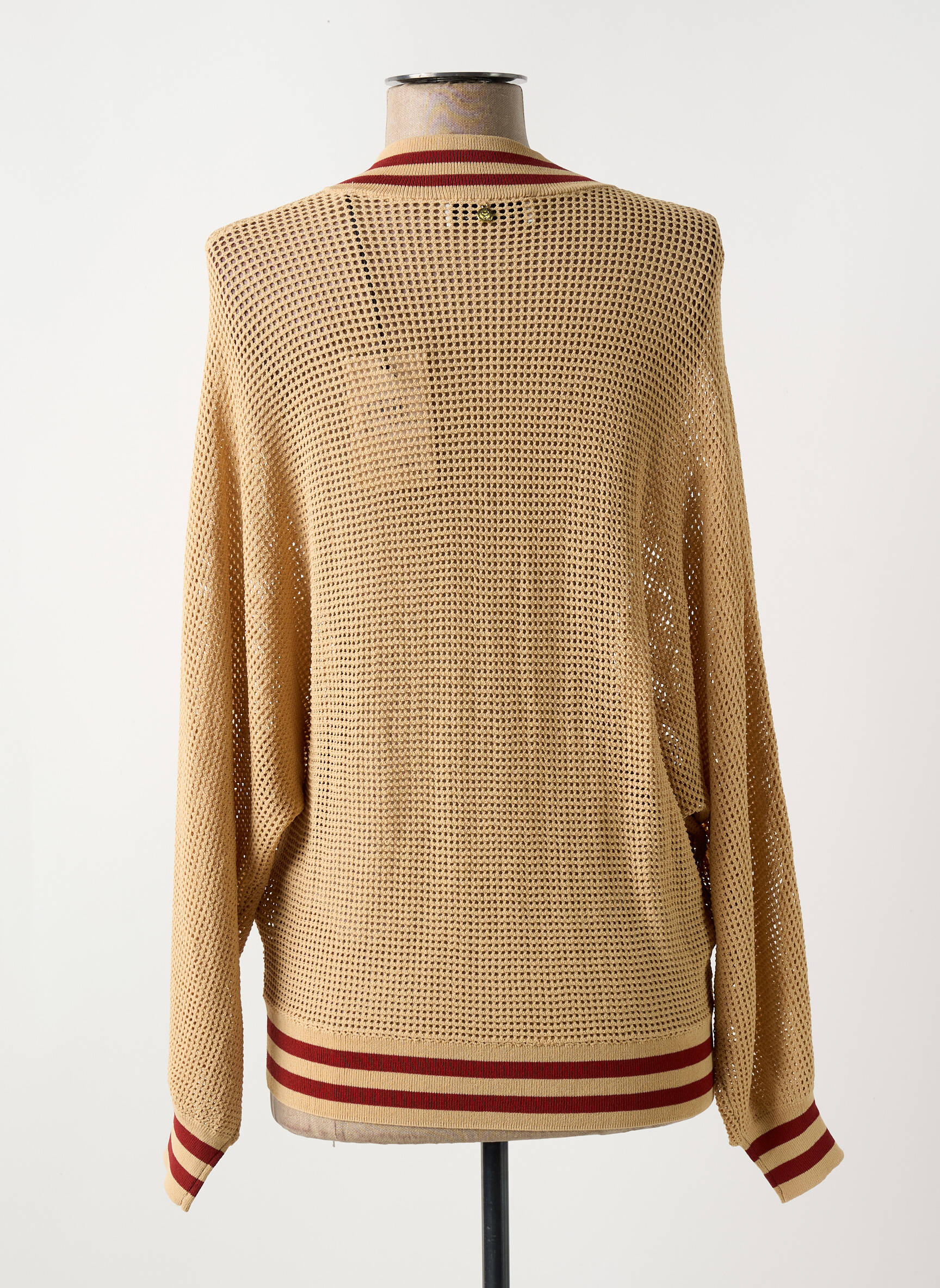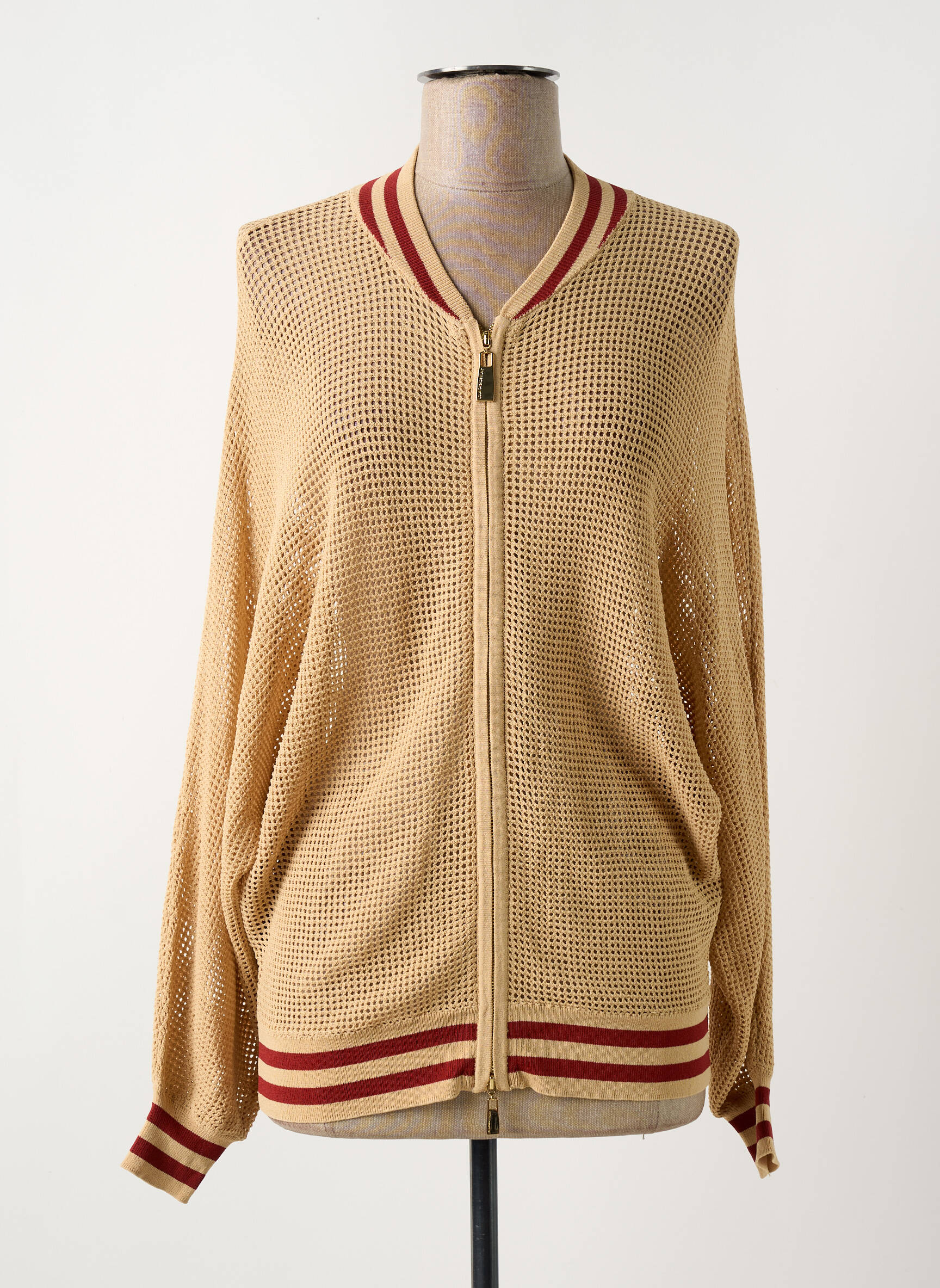 Profitez d’une superbe affaire avec cette veste casual pour femme signée LOLA CASADEMUNT, parfaite pour celles qui veulent ajouter une touche tendance à leur look sans se ruiner. Son maille ajourée légère beige, rehaussée de finitions rayées bordeaux et écru au col, aux poignets et à la taille, apporte un style sport chic idéal pour la mi-saison. Sa coupe zippée et décontractée ainsi que sa matière fluide assurent un confort absolu tout en restant dans l’air du temps, une pièce incontournable pour enrichir votre dressing à prix mini.