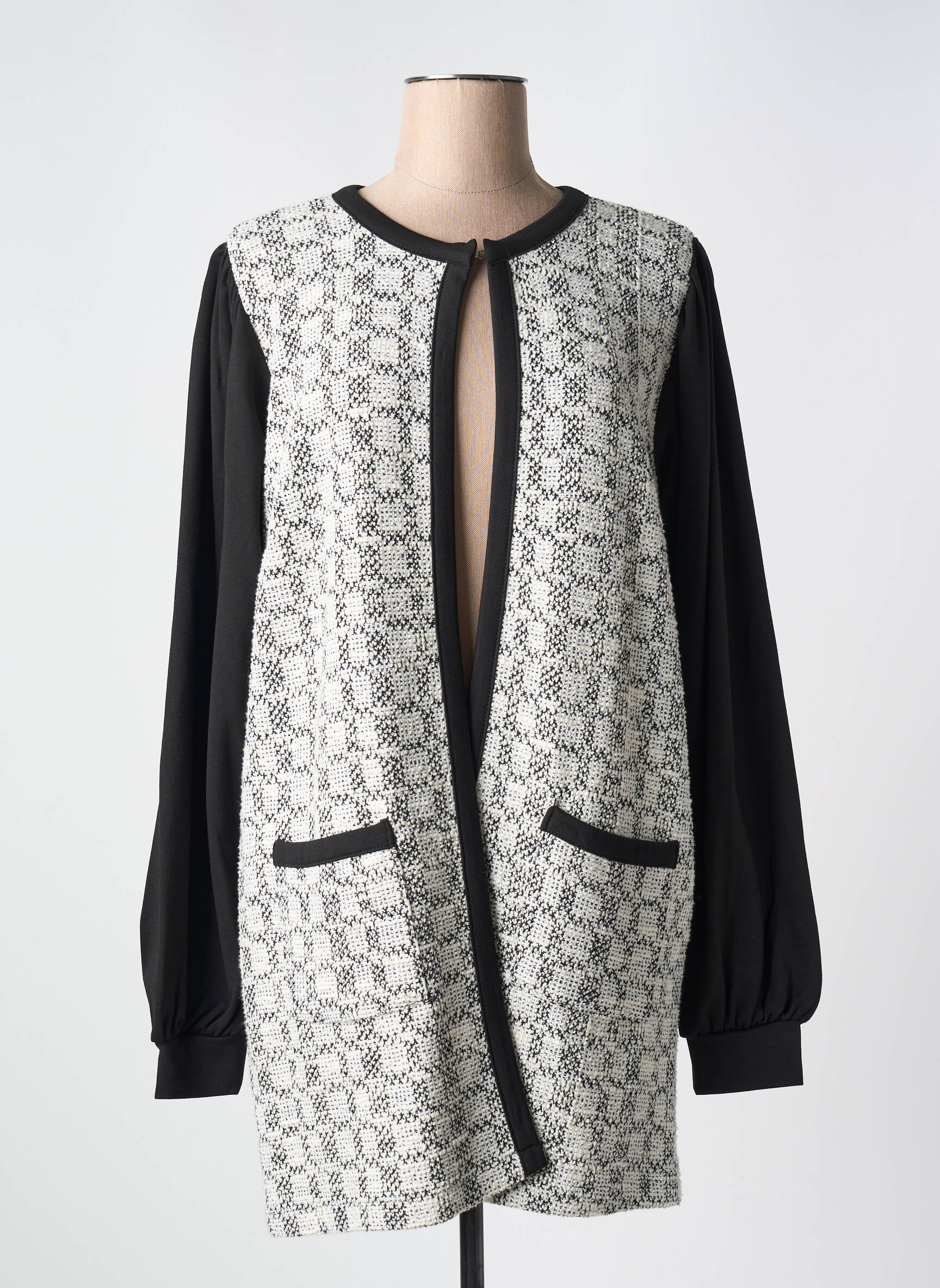Profitez d’une veste casual ZHENZI à prix mini qui combine élégance et confort pour toutes vos sorties du quotidien. Ce modèle séduit par son devant texturé noir et blanc façon tweed, habilement contrasté par des manches longues noires et des bords unis pour un look moderne et facile à porter. Les détails tels que les fausses poches passepoilées ajoutent une touche tendance, idéale pour celles qui aiment être chic sans se ruiner.