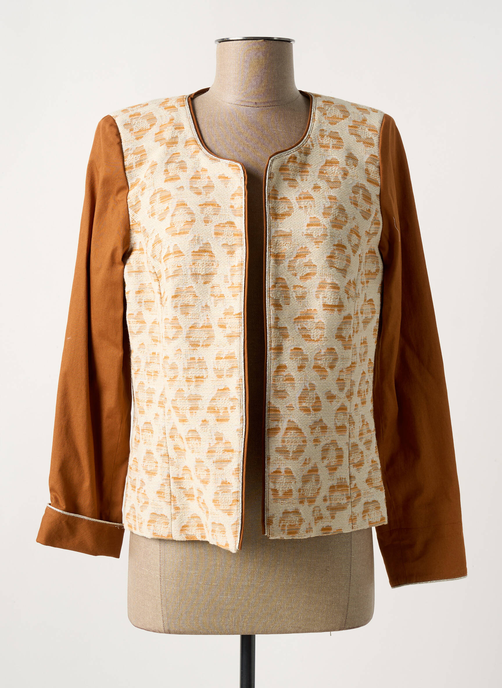 Profitez d’une occasion unique de vous offrir une veste chic signée GREGORY PAT à prix tout doux, idéale pour donner une touche élégante et originale à vos tenues du quotidien comme aux occasions spéciales. Son élégant mélange de tissu à motif beige et orangé sur le devant, associé à des manches unies couleur terre cuite, fait toute la différence et vous permet d’affirmer votre style pour un petit prix.