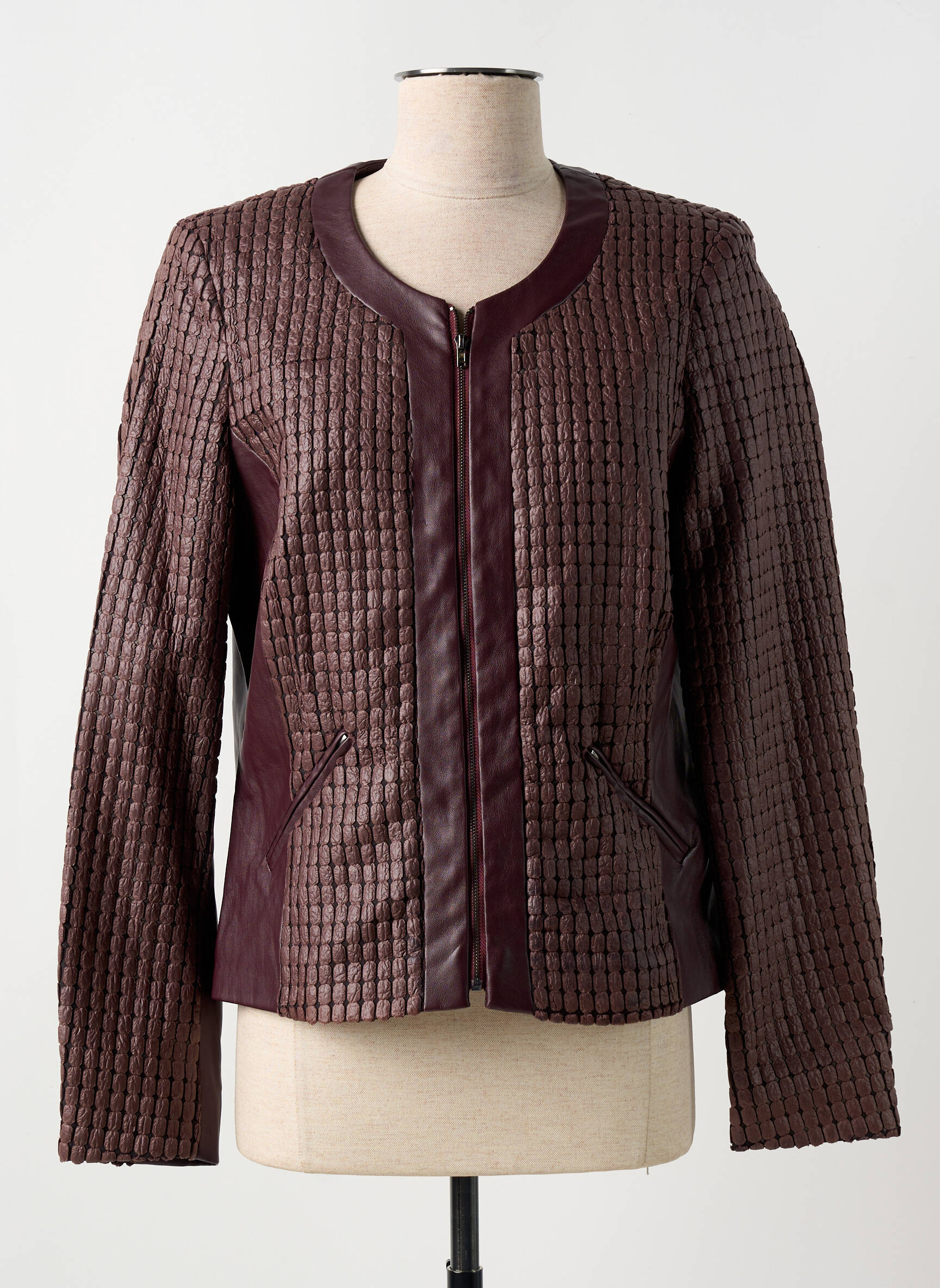 Voici une opportunité à ne pas manquer pour ajouter une touche tendance à votre garde-robe sans vous ruiner : cette veste en simili cuir de la marque MERI & ESCA pour femme allie élégance et originalité avec son aspect matelassé effet tressé et sa finition bordeaux chic. Légère et facile à assortir, elle se distingue par sa coupe moderne et son col rond, tandis que sa fermeture zippée et ses poches discrètes ajoutent une touche de praticité. C’est le bon plan mode du moment pour sublimer vos tenues à prix doux.