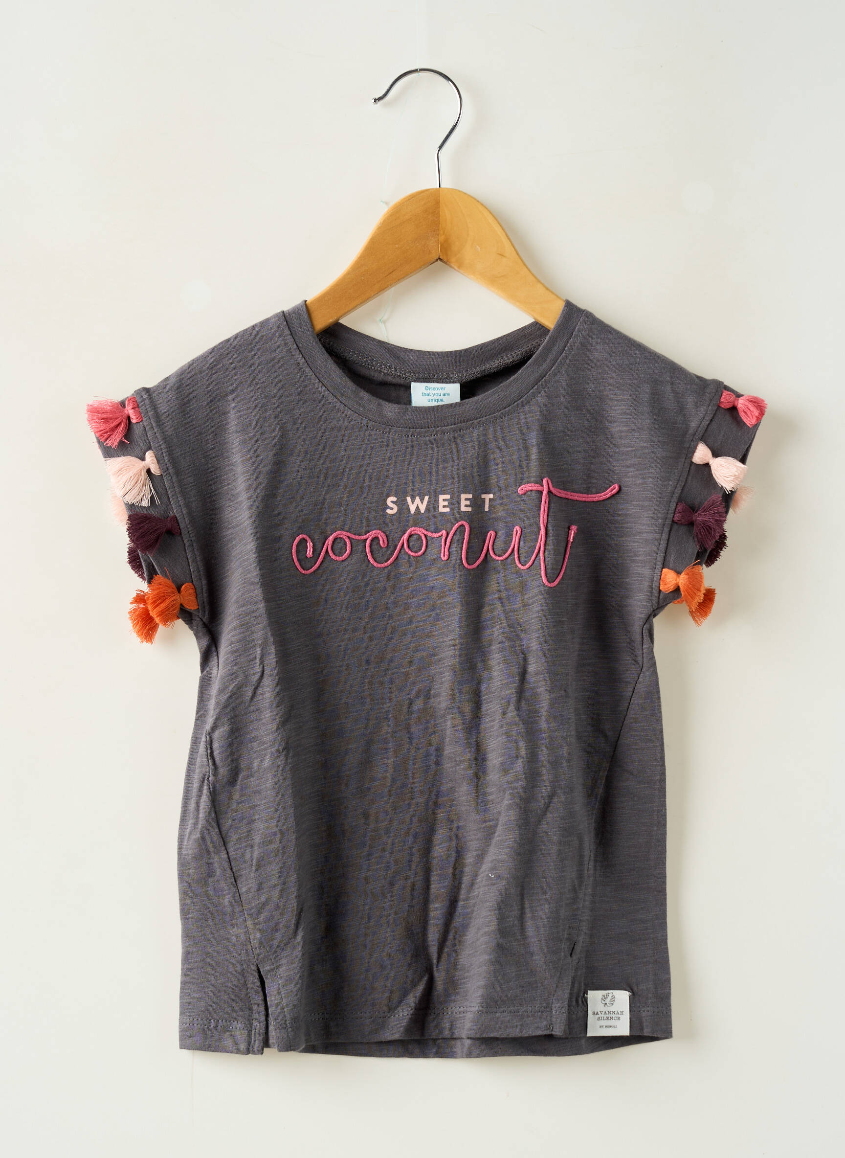 Profitez d’un super bon plan avec ce top fille de la marque BOBOLI qui allie originalité et petit prix, parfait pour ajouter une touche de fantaisie au dressing de votre enfant sans se ruiner. Avec sa jolie inscription “Sweet Coconut” brodée sur l’avant et ses petites franges colorées sur les manches, ce t-shirt apporte une note joyeuse et tendance à toutes les tenues estivales. C’est l’occasion idéale pour faire plaisir à votre fille avec un modèle confortable et plein de peps, tout en faisant des économies.