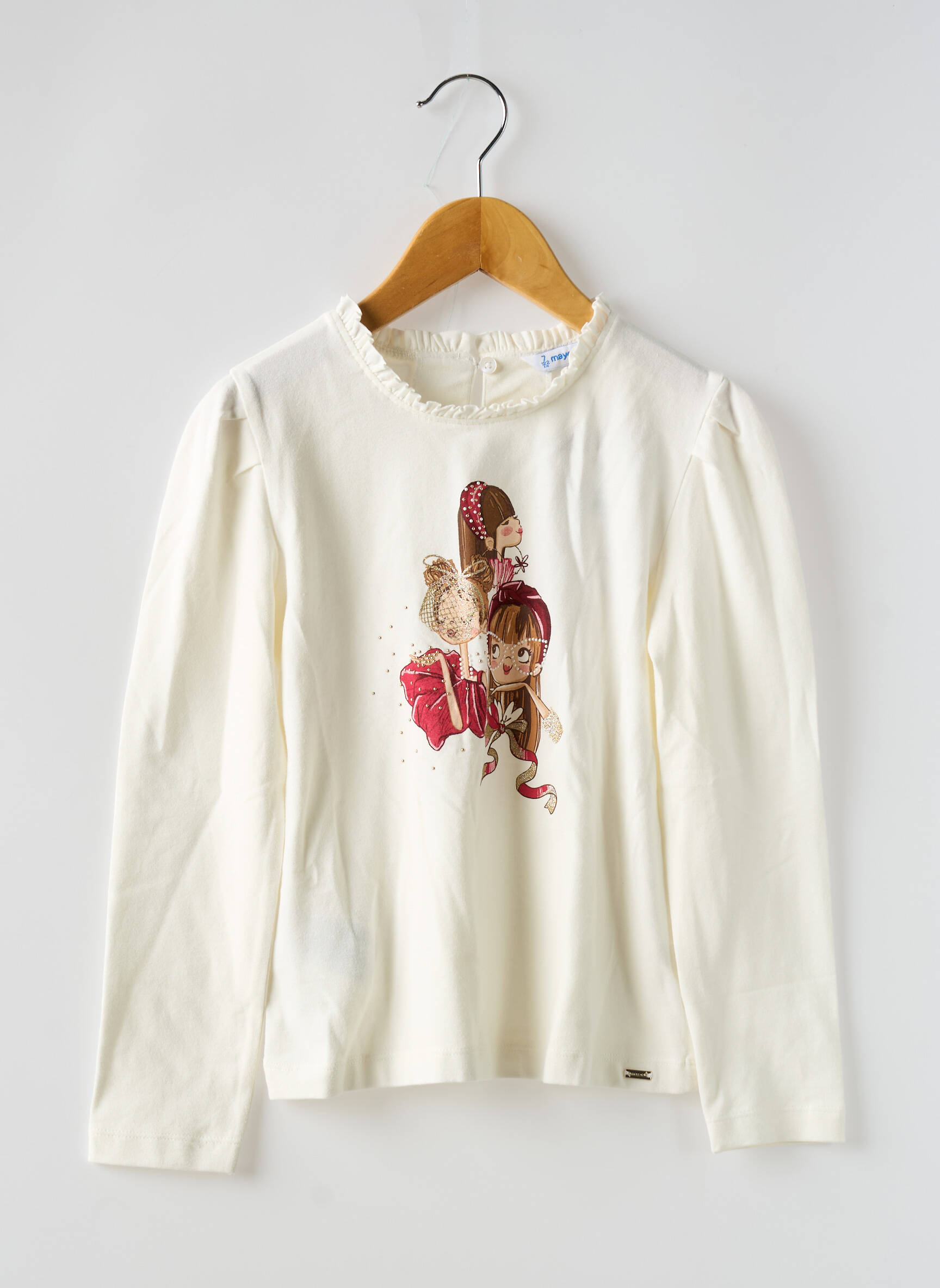 Craquez pour ce joli top Mayoral pour fille, un vrai bon plan pour renouveler le dressing sans se ruiner. Ce haut à manches longues séduit par sa teinte douce rehaussée d’un imprimé délicat et coloré représentant trois petites filles, idéal pour apporter une touche ludique et tendance à toutes les tenues du quotidien. Avec sa coupe confortable et son col légèrement volanté, il allie style et praticité à prix mini, parfait pour les fashionistas en herbe.