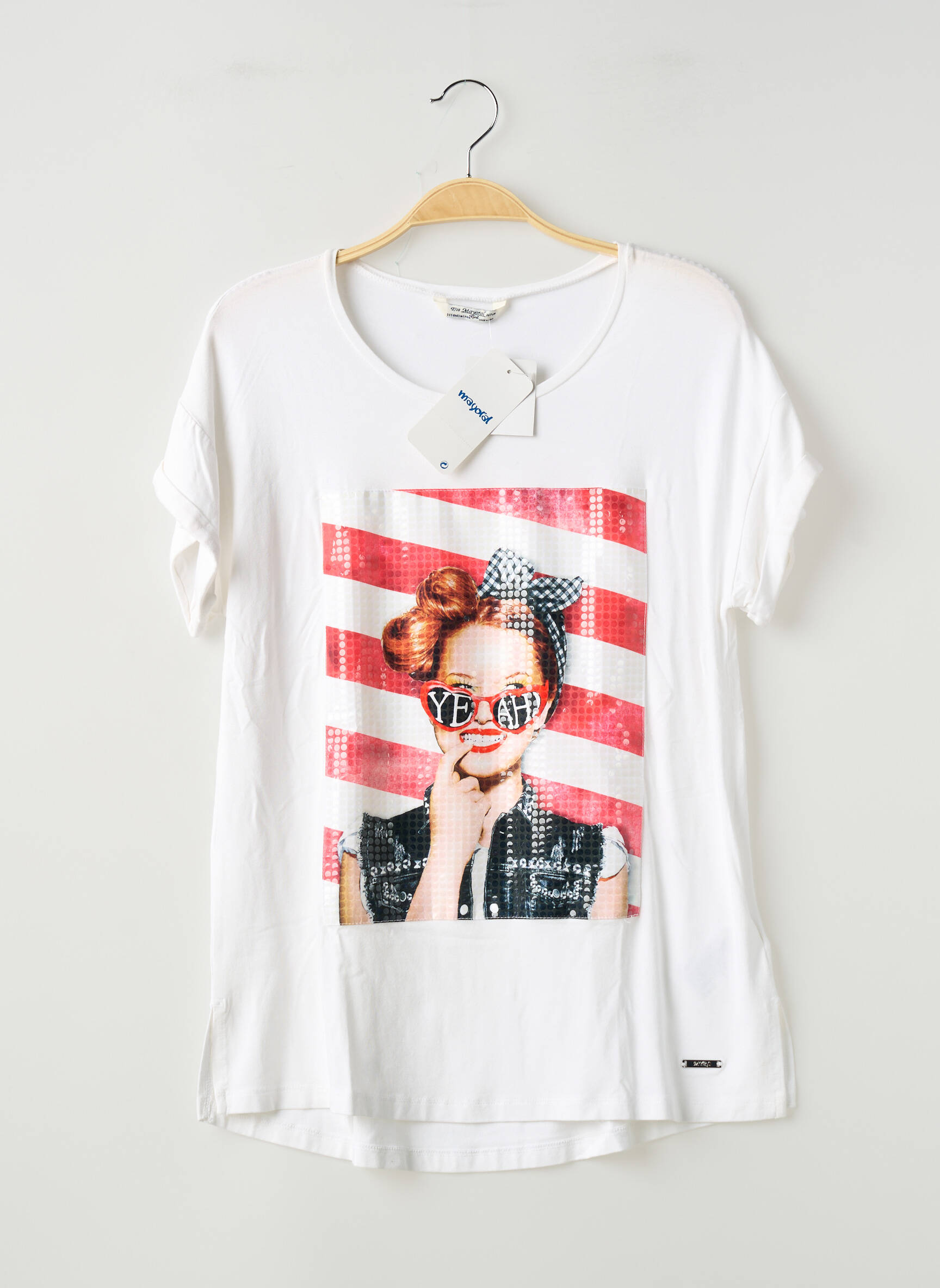 Ce top Mayoral pour fille est une véritable affaire à ne pas manquer pour ajouter une touche tendance à petit prix dans la garde-robe de votre enfant grâce à son design moderne et son imprimé original mettant en avant une jeune fille stylée devant des rayures colorées. Parfait pour un look décontracté mais plein de personnalité, ce haut permet de faire plaisir sans se ruiner tout en profitant d'une pièce unique à l'esprit boutique à prix tout doux.