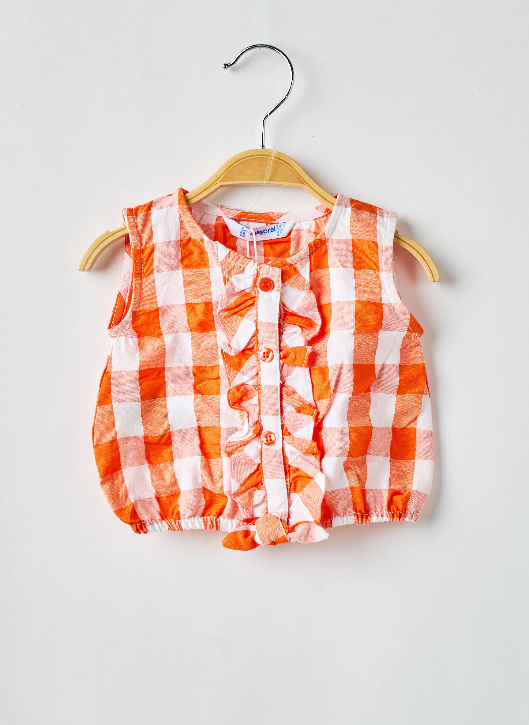 Craquez pour ce top pour fille de la marque Mayoral à petit prix, parfait pour égayer les journées d'été tout en faisant des économies. Avec son motif à grands carreaux orange et blanc, ses jolis volants sur le devant et sa coupe légère, ce haut apporte une touche pleine de fraîcheur et de style au vestiaire des petites fashionistas, tout en profitant d’un vrai bon plan.