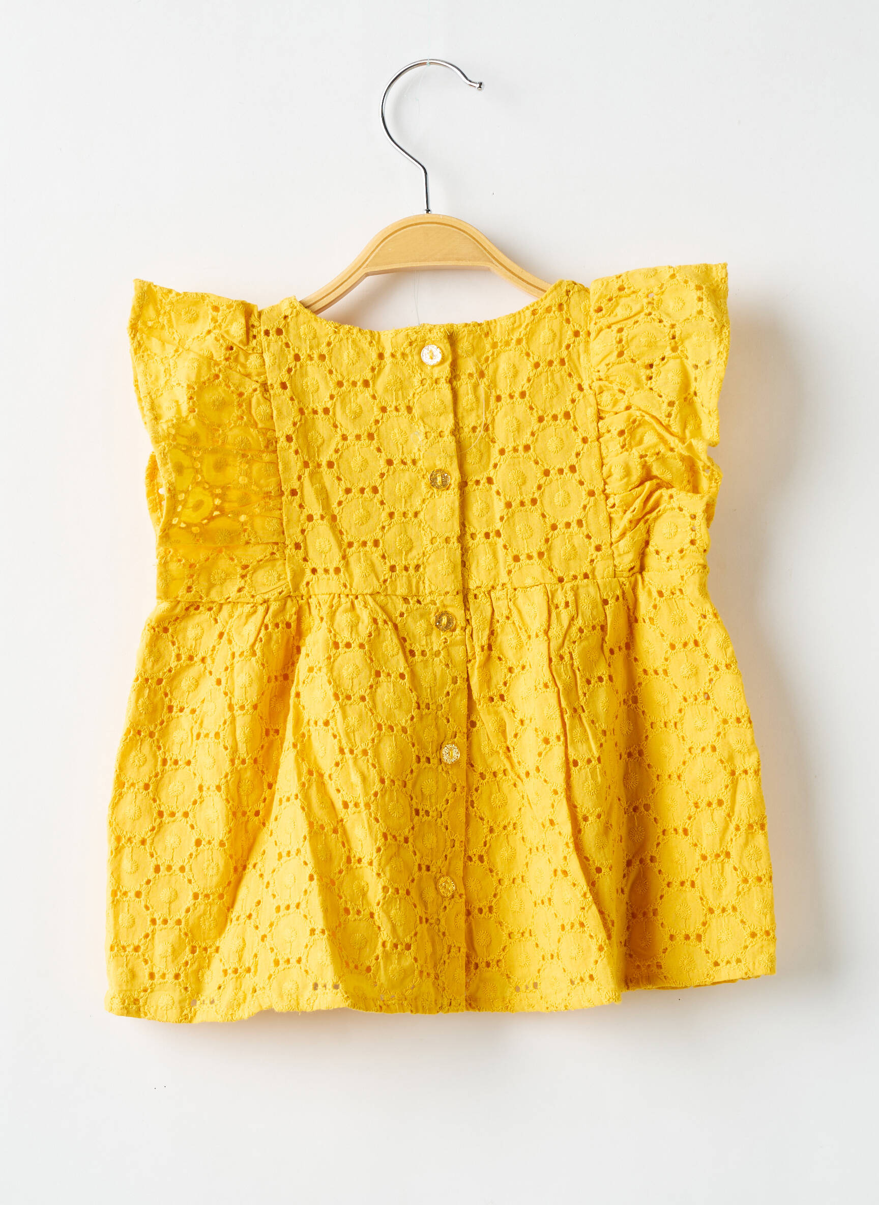 Voici une occasion à ne pas manquer pour habiller votre fille à petit prix avec ce joli top P’TIT BISOU : sa couleur jaune éclatante et son délicat motif brodé ajouré apportent une touche de fraîcheur et de pep’s à toutes les tenues, tandis que la coupe ample et les petits volants sur les épaules promettent confort et liberté de mouvement, le tout à un prix doux pour vos envies de mode.