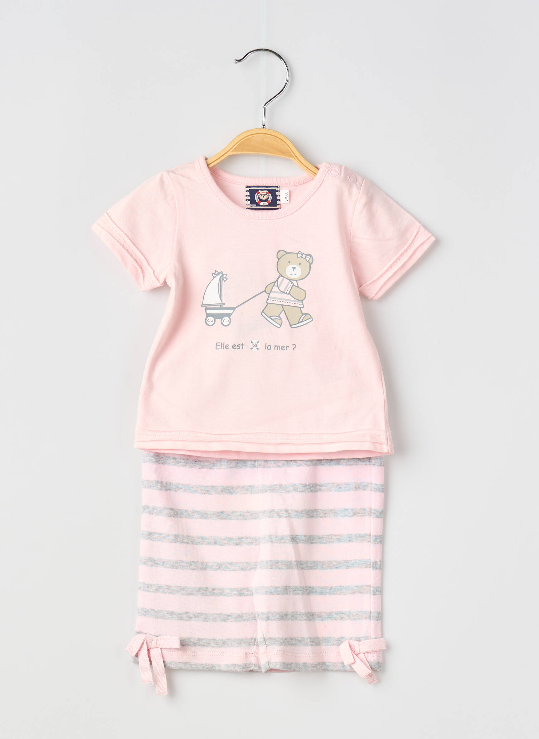 Craquez pour ce joli ensemble pantalon de la marque ELLE EST OU LA MER pour fille, parfait pour profiter d’un look adorable à petit prix. Le haut rose tendre, orné d’un motif ourson charmant, s’accompagne d’un pantalon rayé doux aux finitions nœuds élégantes, pour une tenue aussi confortable que craquante. Cet ensemble est une superbe opportunité de faire plaisir sans se ruiner.