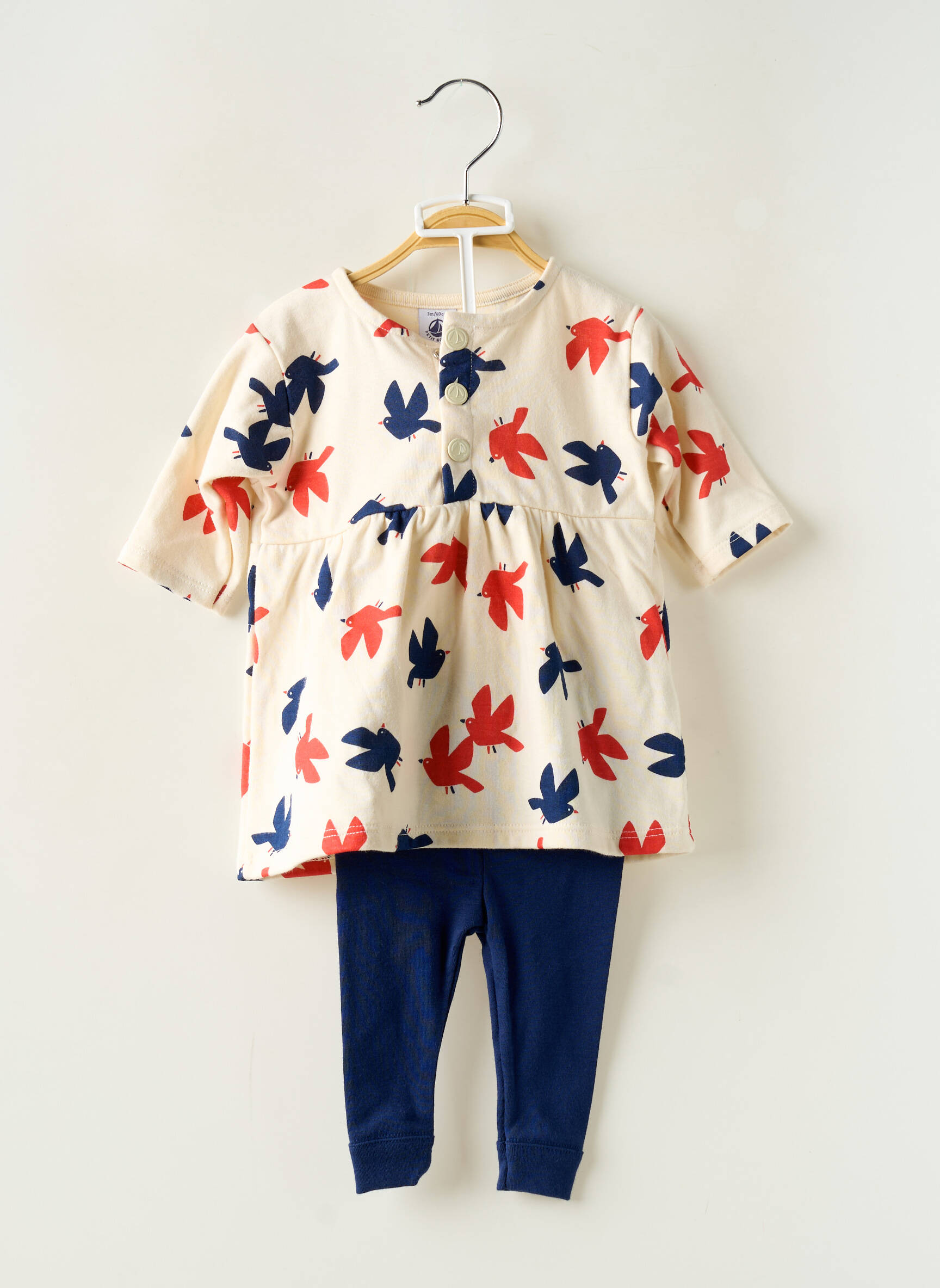 Profitez d’un vrai bon plan pour habiller votre fille avec cet ensemble pantalon de la marque PETIT BATEAU, composé d’une tunique crème à jolies manches courtes, égayée par un imprimé fleuri rouge et bleu, et d’un pantalon leggings uni bleu marine, le tout parfait pour allier confort, style et petit prix sans renoncer à la qualité d’une grande marque.