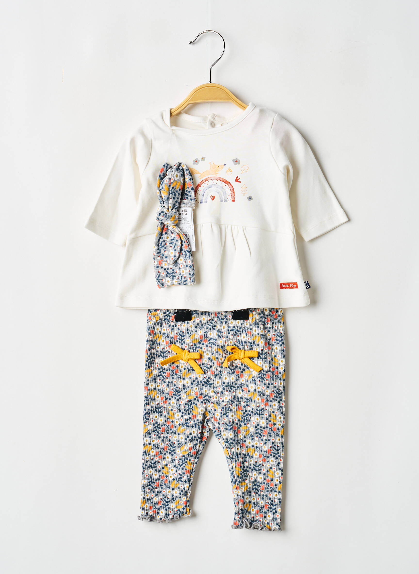 Craquez pour ce ravissant ensemble pantalon pour fille de la marque SUCRE D’ORGE à prix mini, idéal pour habiller votre enfant avec style tout en maîtrisant votre budget. Ce lot comprend un haut crème orné d’un joli motif arc-en-ciel et d’un détail volanté sur le devant, accompagné d’un pantalon fleuri aux couleurs vives ponctué de petits rubans jaunes pour une touche pétillante et d’un bandeau assorti pour parfaire la tenue. Parfait pour allier confort, douceur et petit prix, cet ensemble est un vrai bon plan à ne pas laisser passer.
