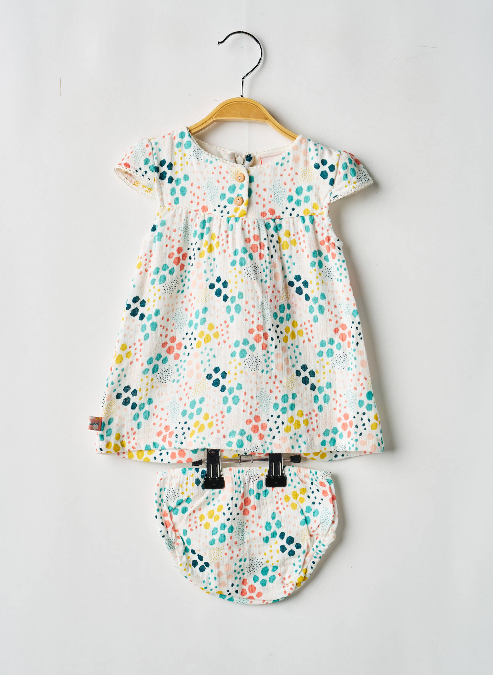 Profitez d’un bon plan pour habiller votre fille avec style grâce à cet ensemble short de la marque BOBOLI, composé d’une jolie robe légère à manches courtes accompagnée de son bloomer assorti, le tout orné d’un imprimé à pois multicolores plein de fraîcheur qui apporte une touche pétillante au quotidien, le tout à petit prix pour faire des économies sans sacrifier la qualité.
