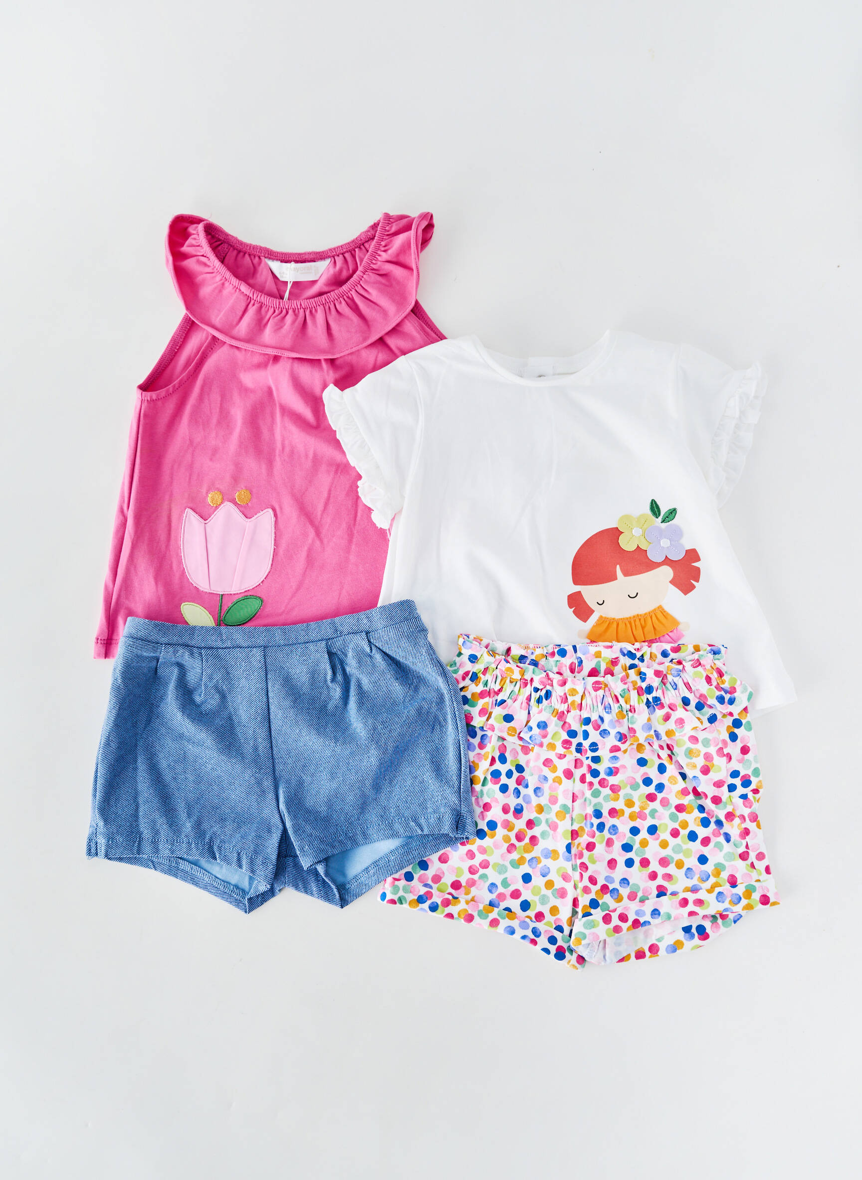 Profitez d'un super bon plan avec cet ensemble short de la marque MAYORAL pour fille, parfait pour accompagner l’été avec style et à petit prix. Le lot comprend un débardeur rose orné d’un motif tulipe et un t-shirt blanc à imprimé coloré, à assortir avec un short bleu uni ou un short à pois multicolores pour varier les looks selon les envies. Cet ensemble propose des tenues pleines de fraîcheur pour un excellent rapport qualité-prix, idéal pour renouveler la garde-robe de votre enfant sans se ruiner.