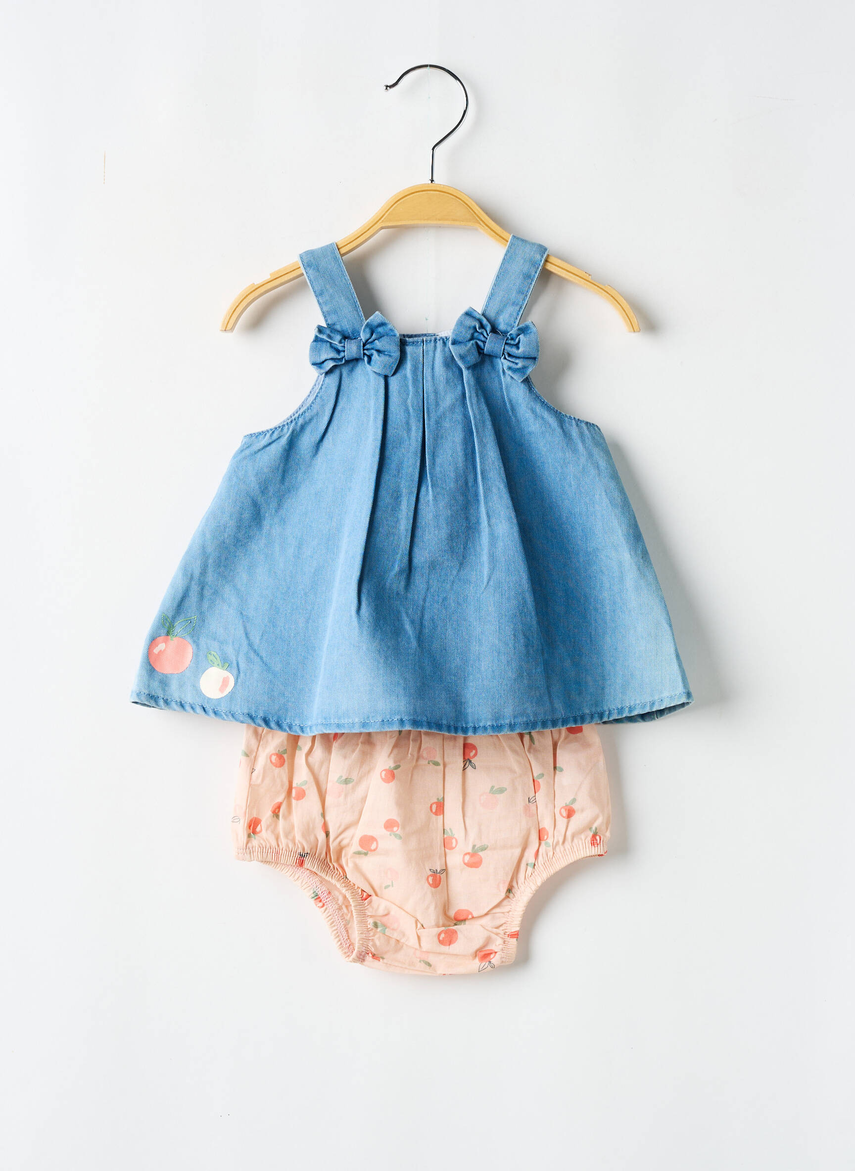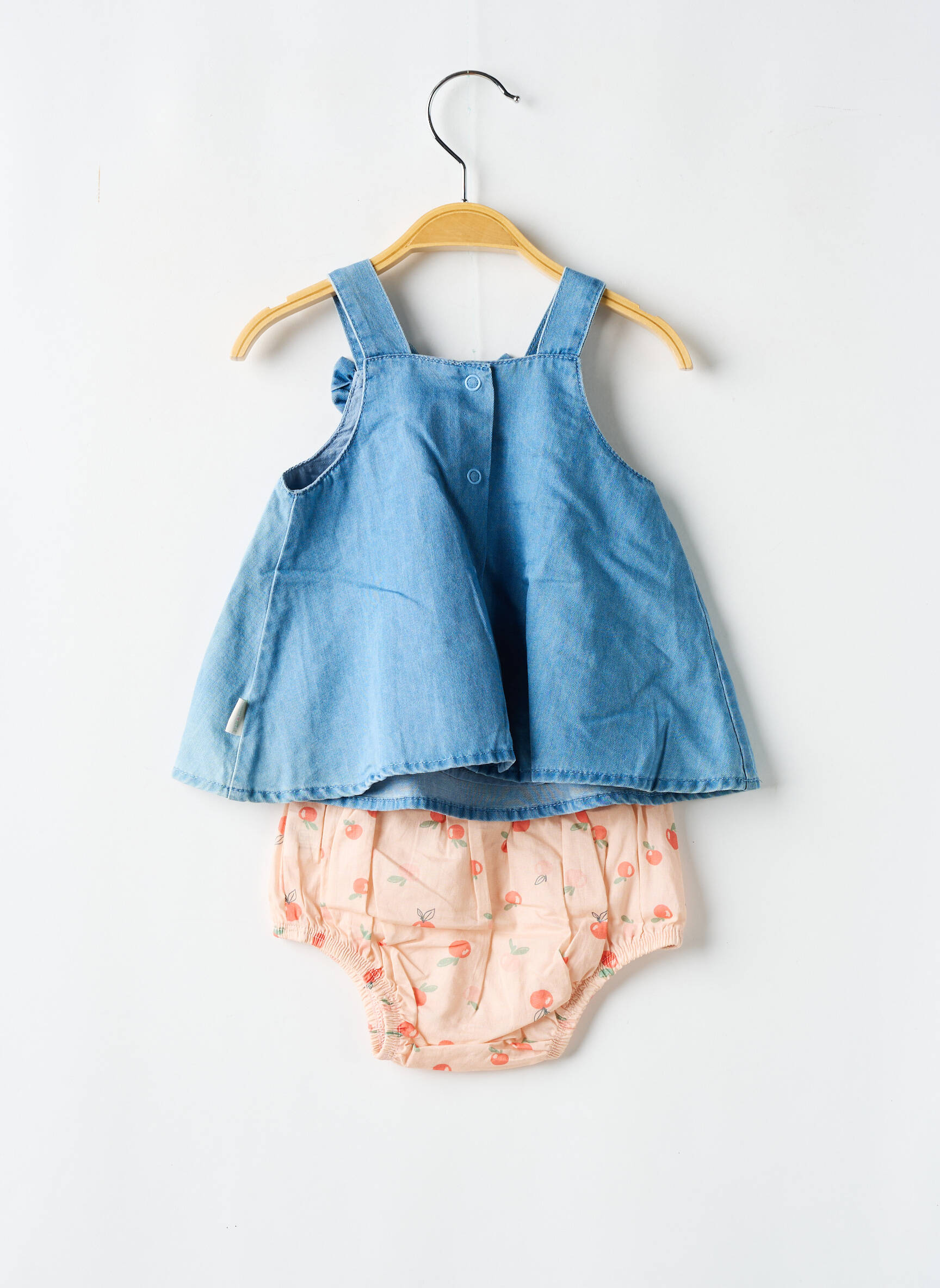 Craquez pour cet ensemble short P'TIT BISOU pour fille à petit prix, parfait pour offrir à votre enfant un look tendance sans se ruiner. Le haut en denim orné de petits nœuds et de motifs cerises apporte une touche de fraîcheur, tandis que le short assorti imprimé s’enfile facilement pour un confort optimal toute la journée. C’est l’occasion idéale de faire des économies sur une tenue craquante et pratique pour l’été.