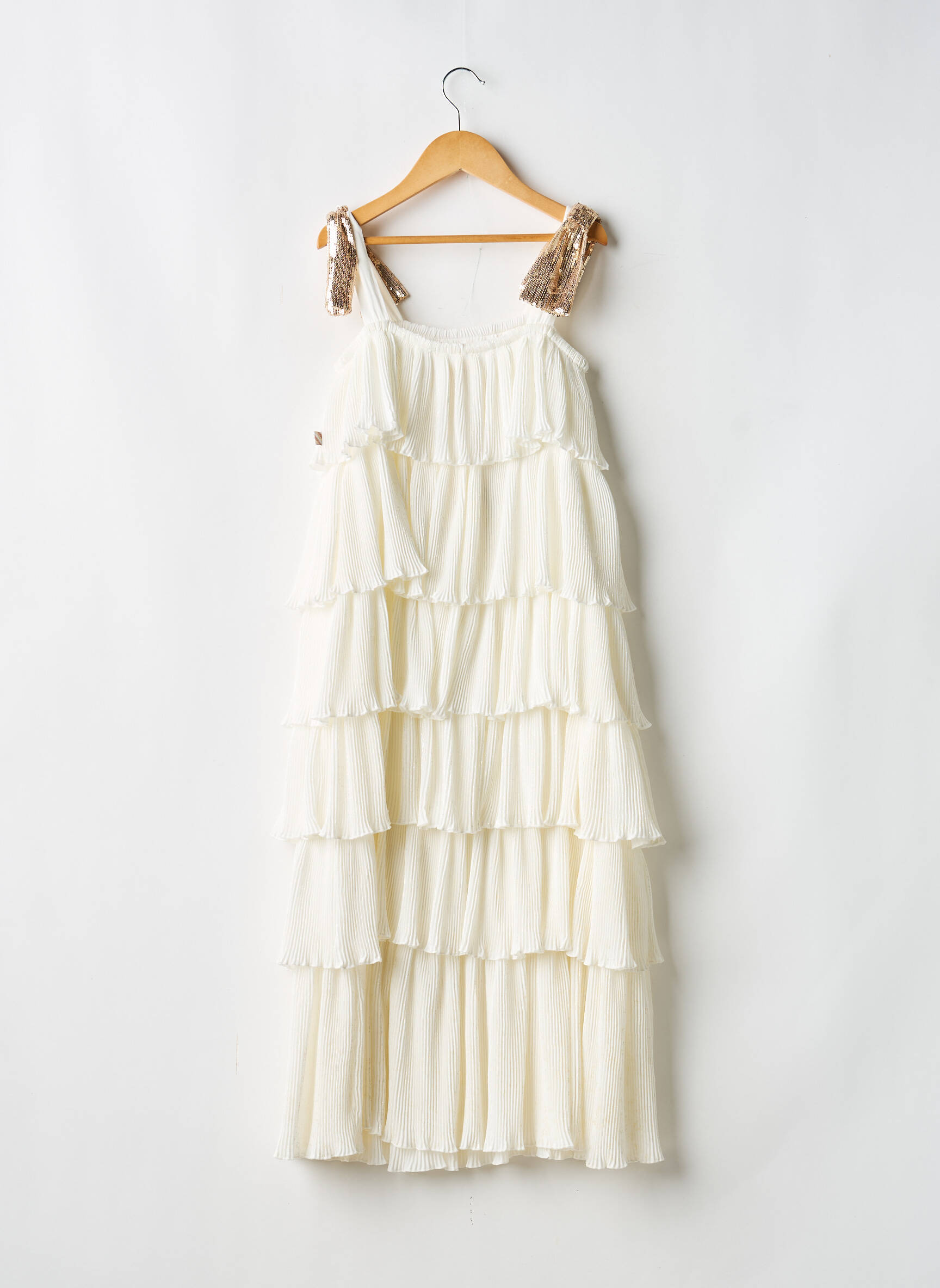 Profitez d’une occasion à prix mini pour offrir à votre fille cette superbe robe longue Billieblush, qui mêle élégance et légèreté avec ses volants à étages, son tissu fluide et ses bretelles nouées ornées d’une touche pailletée. Un choix malin pour une tenue de cérémonie ou de fête qui promet un effet wahou sans vous ruiner.