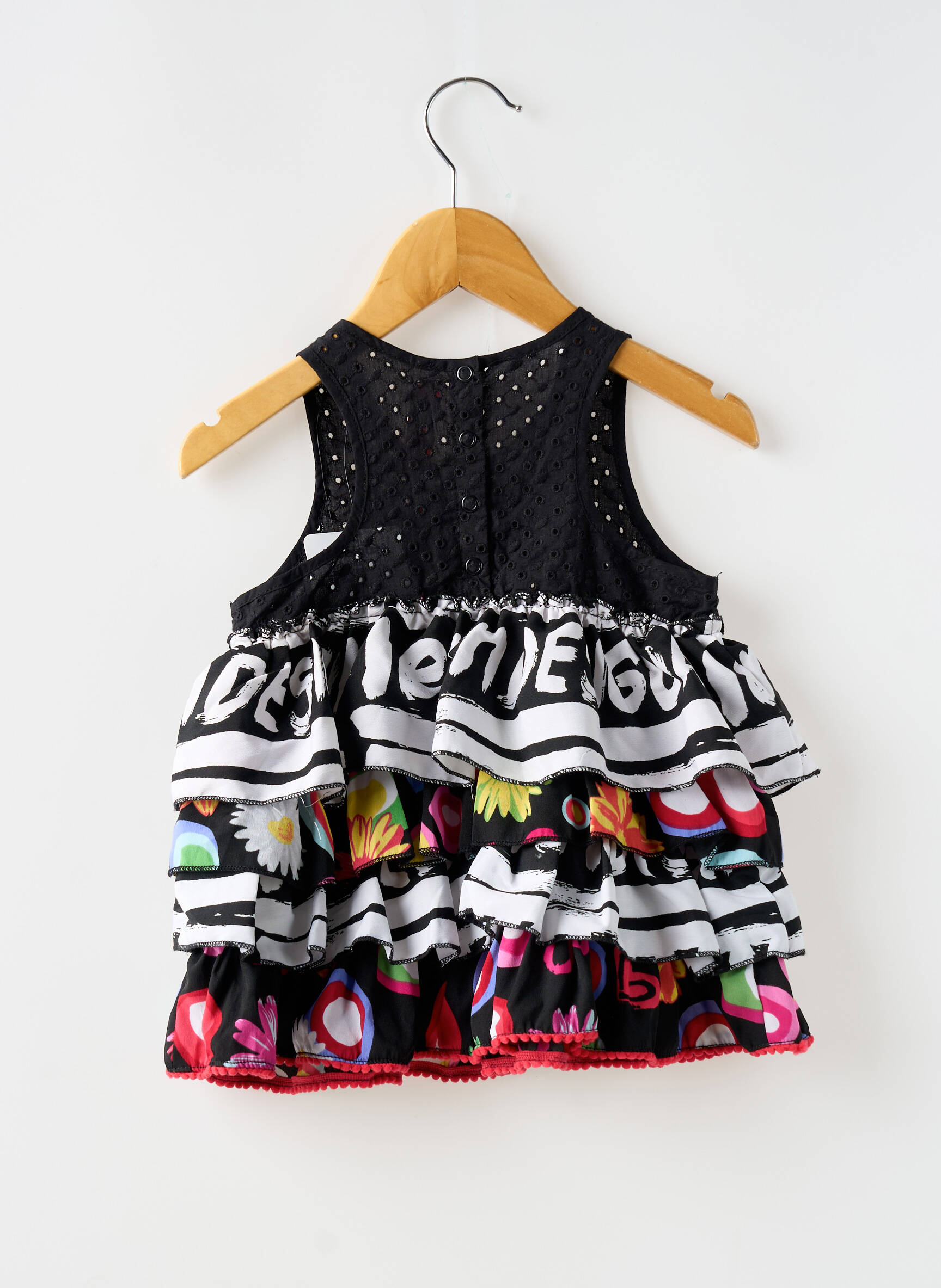 Craquez pour cette robe mi-longue Desigual pour fille, une pièce originale à petit prix qui apportera une touche de couleur et de gaieté à la garde-robe de votre enfant. Ce modèle se distingue par son haut noir délicatement ajouré, mis en valeur par une grosse marguerite brodée, ainsi que des volants successifs ornés de motifs colorés et de larges logos qui font tout le charme de la marque, le tout réunissant look tendance et économies malines.