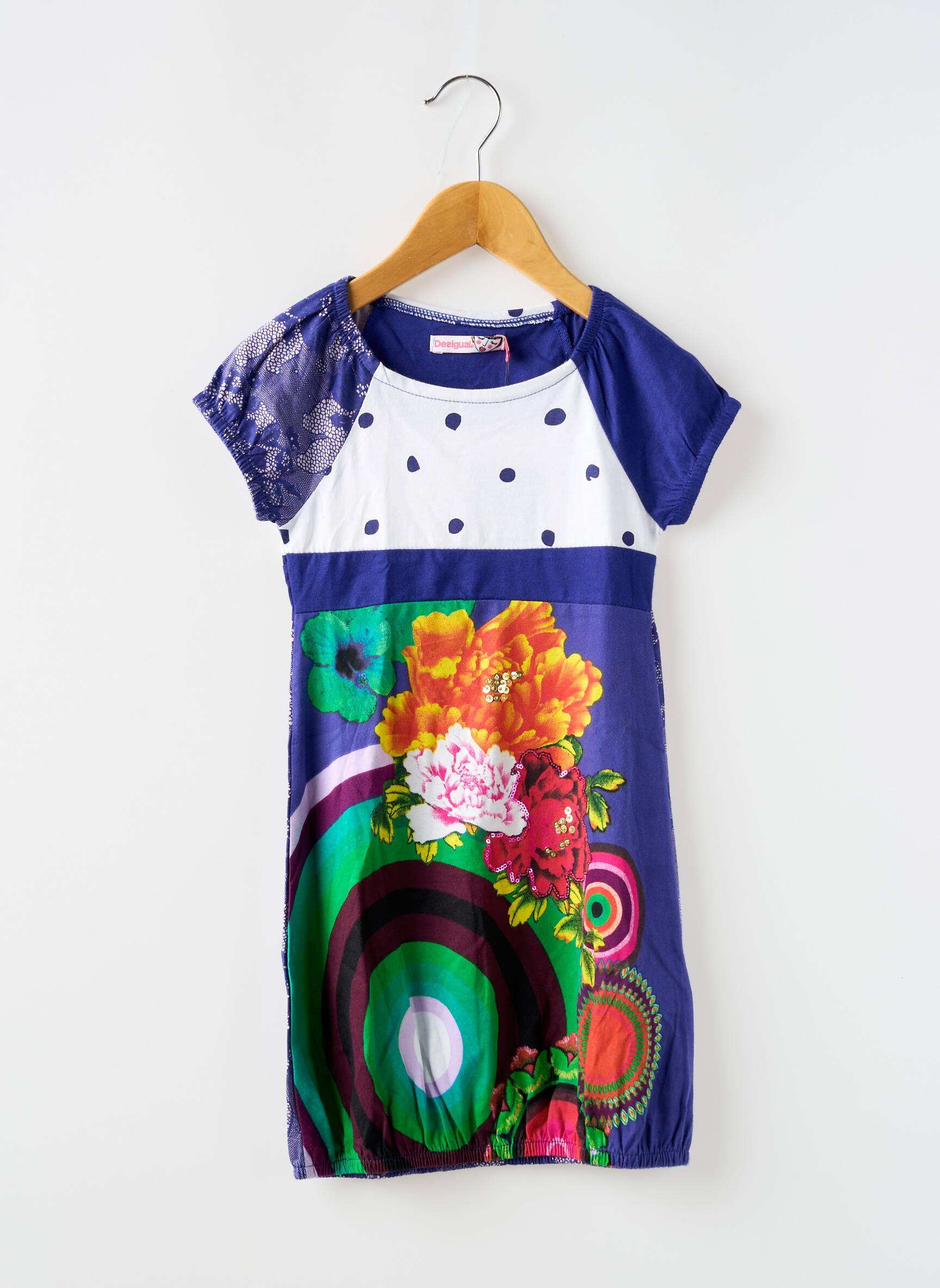 Voici une robe mi-longue Desigual pour fille qui allie originalité et style à prix tout doux, idéale pour faire plaisir sans se ruiner. Avec ses motifs uniques mêlant pois, fleurs colorées et touches de dentelle sur une manche, cette pièce pleine de peps est parfaite pour donner une touche joyeuse et tendance à toutes les garde-robes, une vraie opportunité de dénicher un vêtement de marque à petit prix.