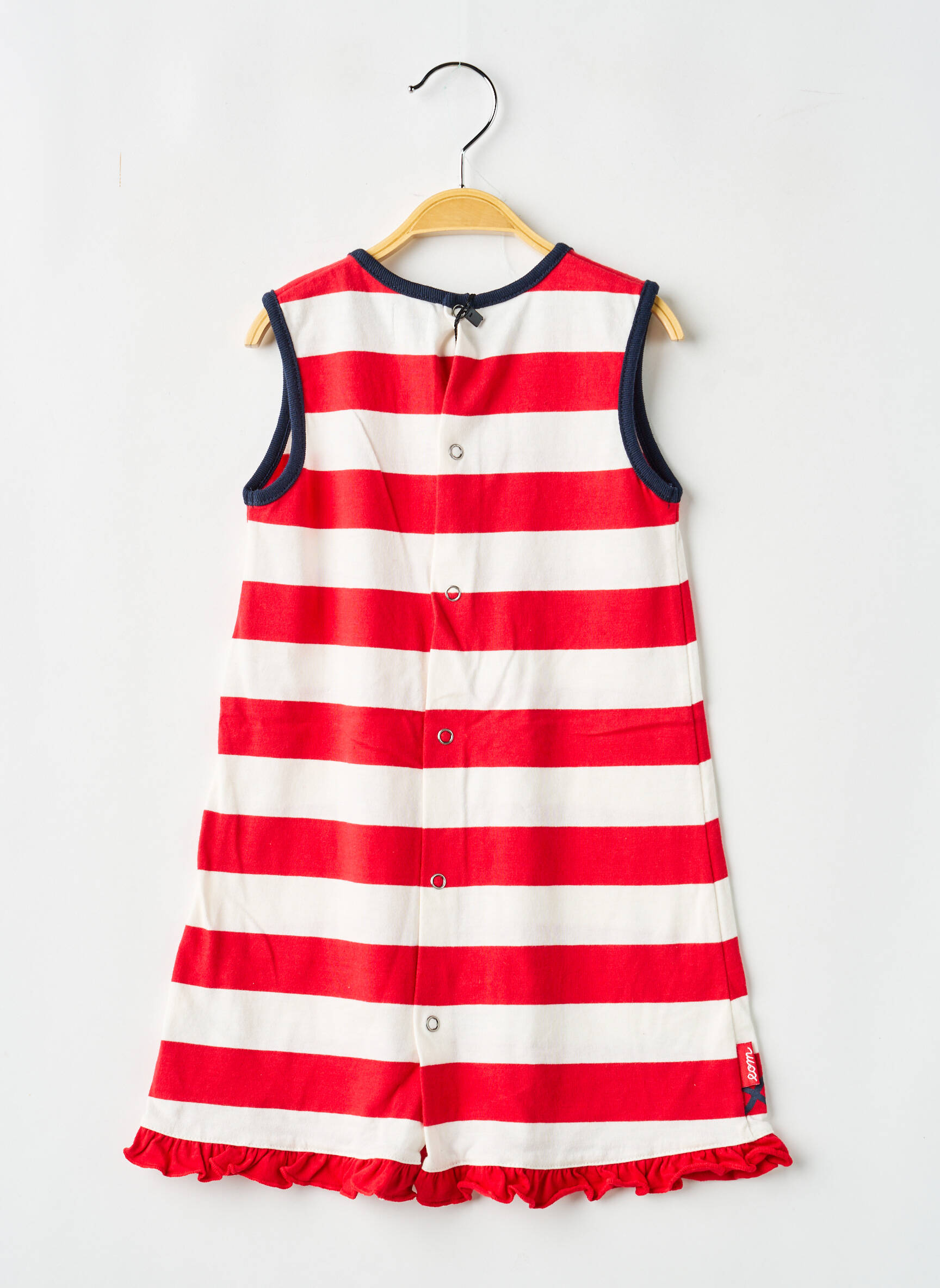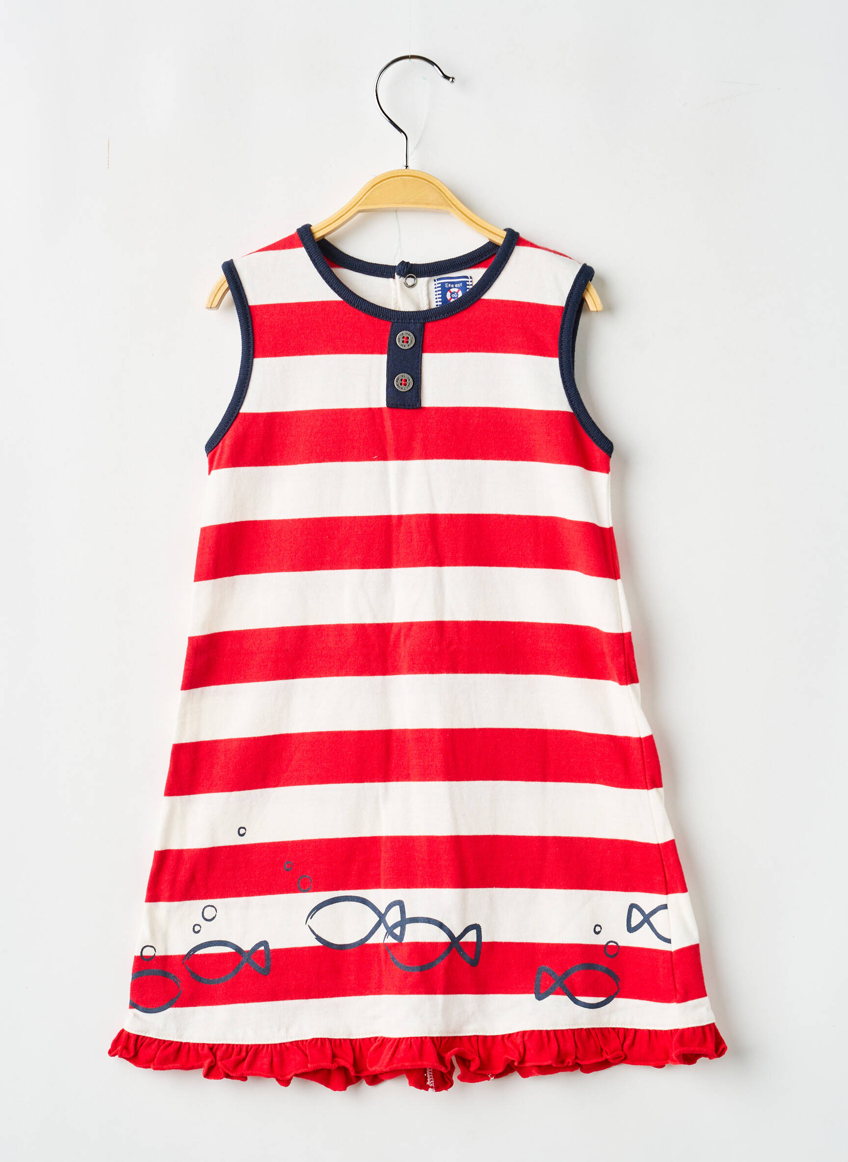 Profitez d’une vraie affaire avec cette robe mi-longue pour fille signée ELLE EST OU LA MER, parfaite pour faire plaisir sans se ruiner. Cette pièce colorée séduit immédiatement avec ses rayures larges rouges et blanches, son encolure soulignée par un fin liseré bleu marine et le détail de petits poissons imprimés façon dessin au bas de la robe qui apporte une touche ludique. On aime aussi la finition volantée à la base qui donne de l’allure, pour un prix mini qui fait toute la différence.