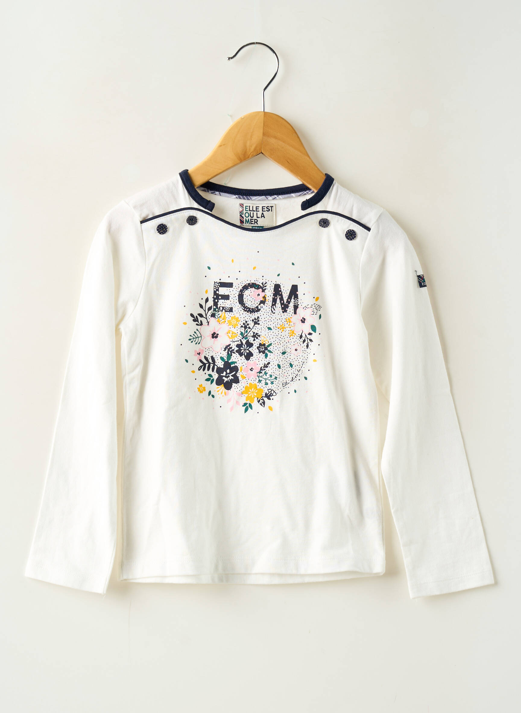 Profitez d’un petit prix pour offrir à votre fille un T-shirt de la marque ELLE EST OU LA MER, parfait pour apporter une touche de fraîcheur à sa garde-robe sans vous ruiner. Ce modèle à manches longues séduit avec son fond blanc lumineux, son motif fleuri délicatement coloré et l’inscription lumineuse « EOLM » sur le devant. Les petits détails comme les boutons décoratifs aux épaules ajoutent une note tendance et girly à ce basique indémodable, idéal pour une tenue à la fois confortable et pleine de style. C’est le bon plan mode pour une pièce de marque à prix tout doux.