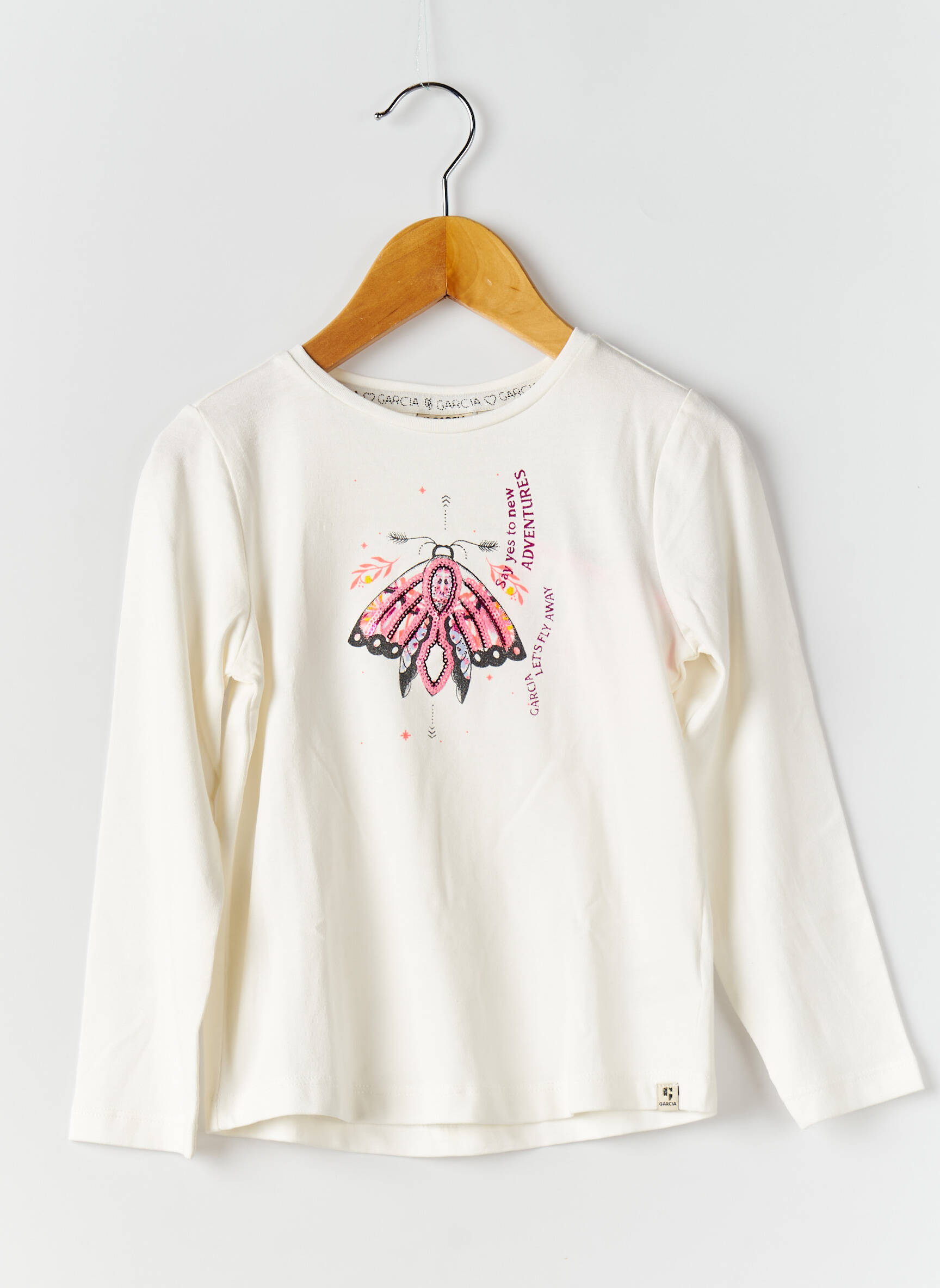 Profitez d’un bon plan avec ce T-shirt pour fille signé GARCIA, une pièce incontournable à petit prix pour renouveler la garde-robe de votre enfant sans se ruiner. Ce modèle à manches longues arbore un coloris blanc éclatant, sublimé par un joli motif papillon aux notes rose et noir, accompagné de petits détails graphiques tendance qui apportent une touche de fantaisie. Il se distingue par son look doux et poétique, parfait pour un style quotidien confortable et moderne, le tout à prix malin !