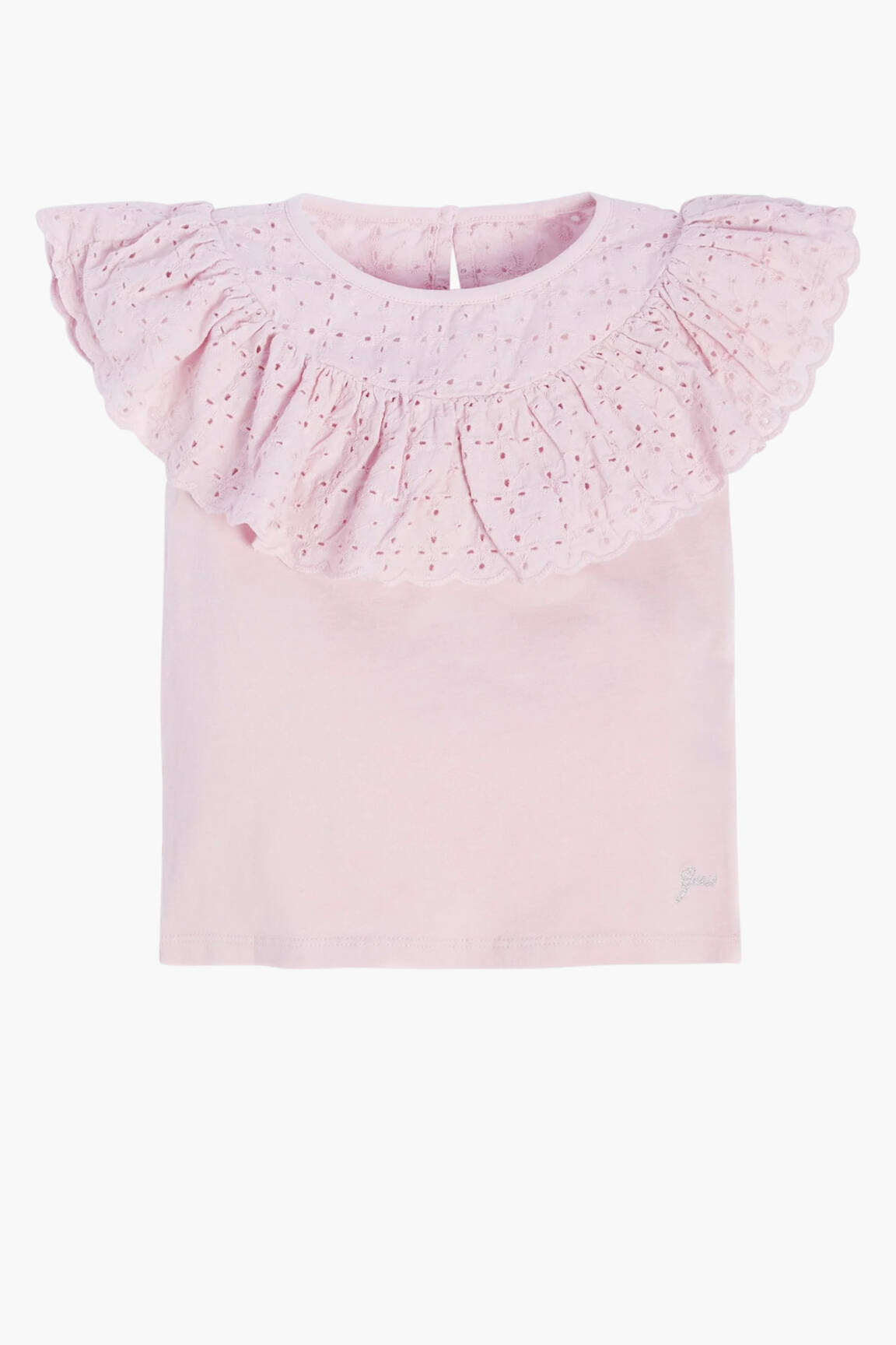 Si la douceur pouvait se porter en vêtement, ce T-shirt GUESS pour fille en serait l'incarnation parfaite avec son rose tendre illuminé d'un large volant en broderie anglaise délicate qui apporte un air romantique et léger à cette pièce.
