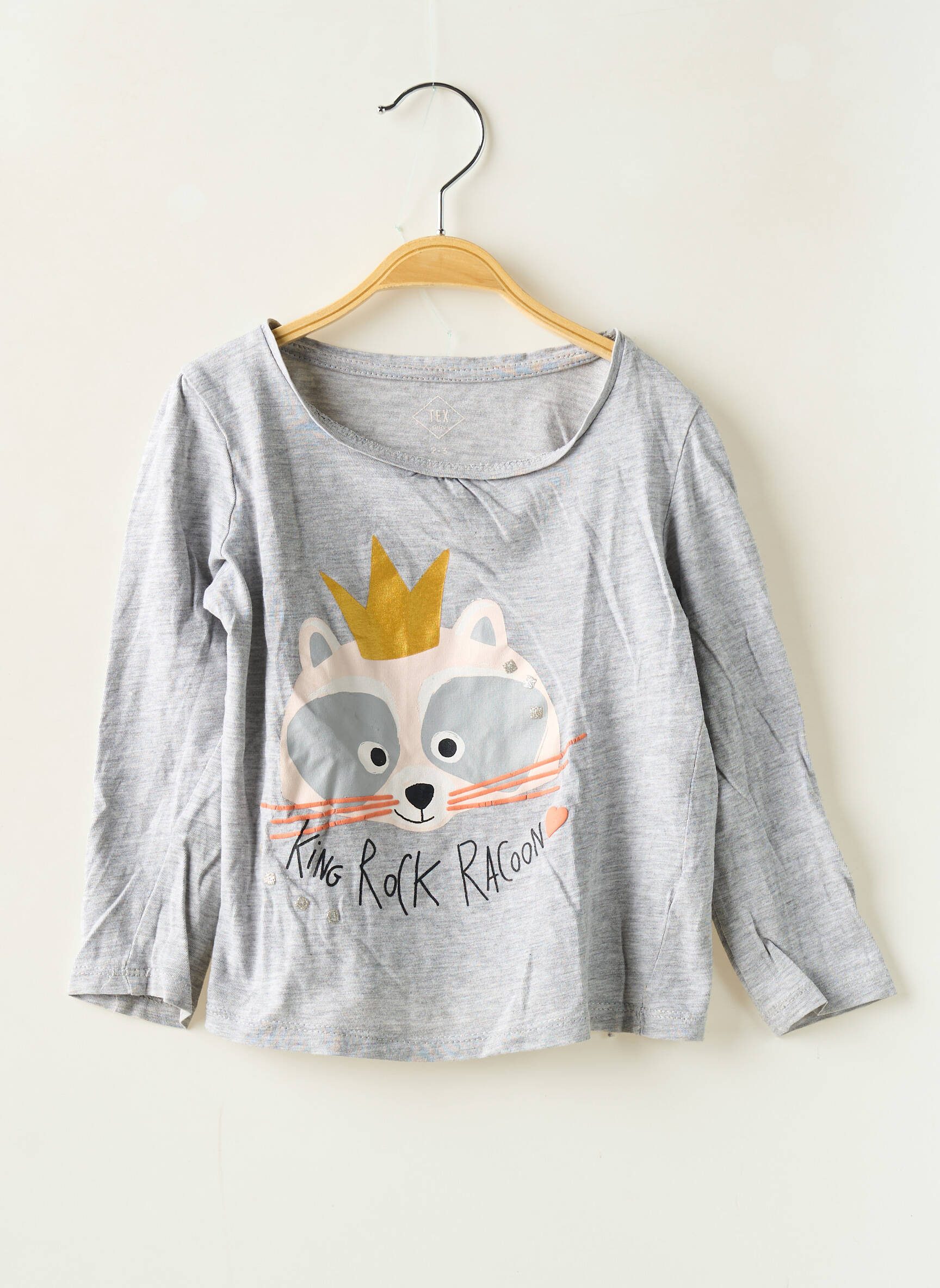 Profitez d’un super bon plan avec ce T-shirt fille signé TEX, idéal pour offrir un look tendance sans vous ruiner. Son adorable motif raton laveur couronné et son inscription "King Rock Raccoon" ajoutent une touche ludique à ce haut gris à manches longues, parfait pour accompagner chaque journée d’aventure à petit prix.