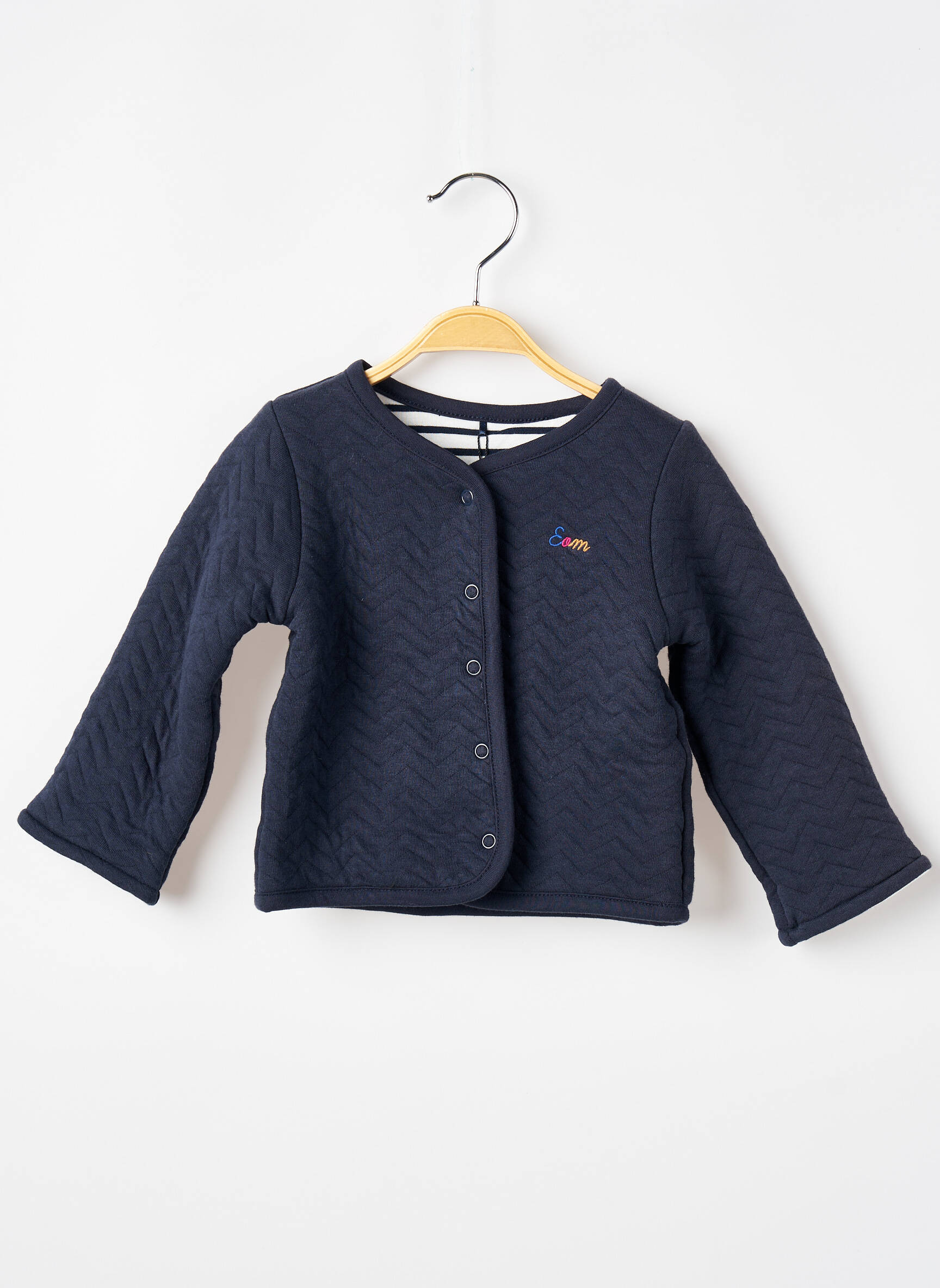 Imaginez une veste qui enveloppe comme un doux câlin : cette pièce casual signée ELLE EST OU LA MER pour fille se distingue par sa texture matelassée subtilement ondulée et sa coupe droite qui allie confort et élégance. Son bleu profond, rehaussé d'un petit logo coloré discret sur la poitrine, invite à des looks à la fois simples et raffinés, tandis que les boutons pression apportent une touche pratique et moderne à ce basique indispensable.