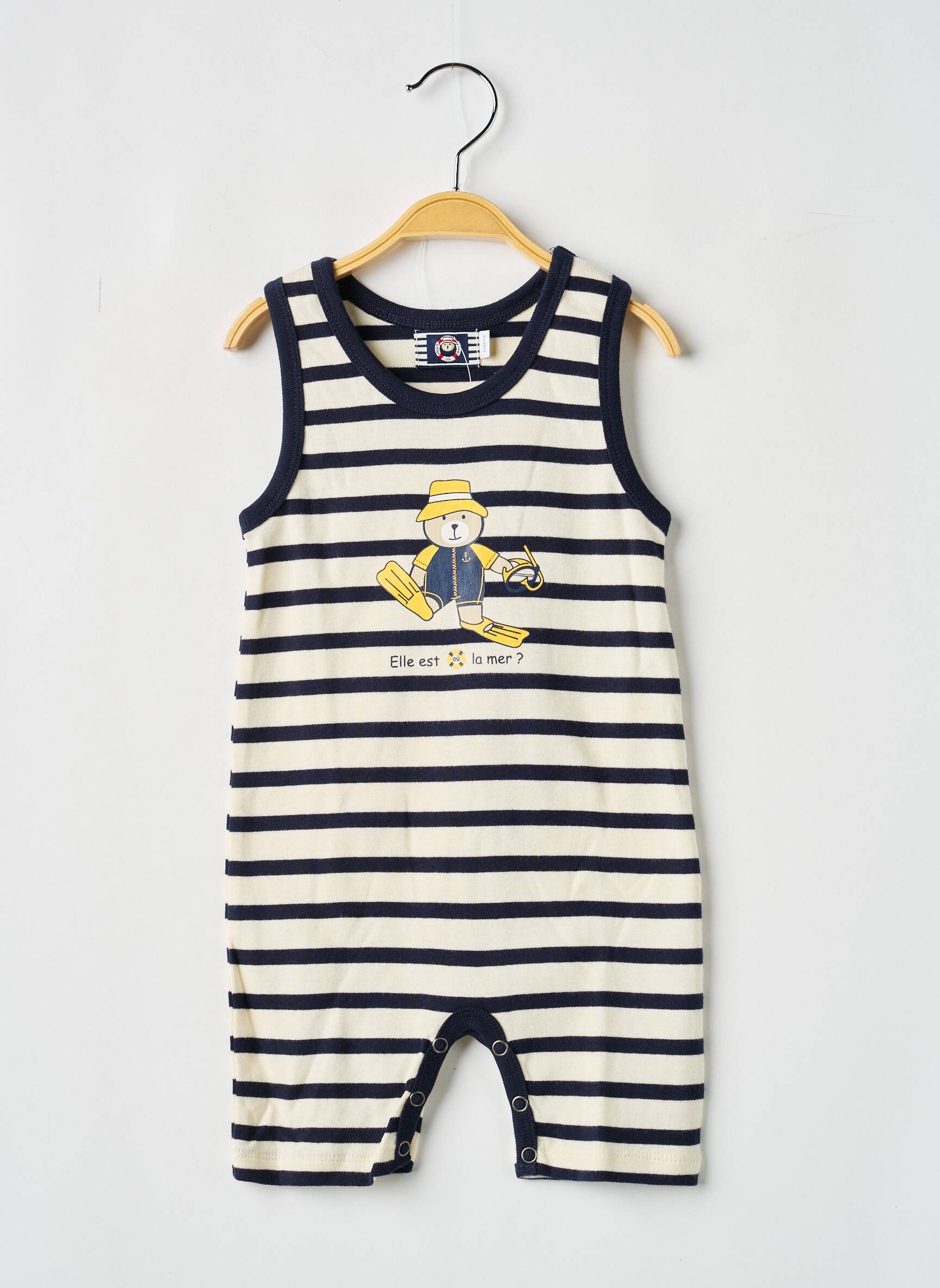 Craquez pour ce joli combishorts garçon signé ELLE EST OU LA MER, une vraie opportunité à petit prix pour donner à votre enfant un look marin tendance et confortable. Son motif rayé bleu marine et blanc accompagné d’un ourson habillé en marin apporte une touche ludique parfaite pour l’été, tandis que ses boutons-pression à l’entrejambe facilitent l’habillage au quotidien, le tout pour une pièce agréable à porter sans se ruiner.