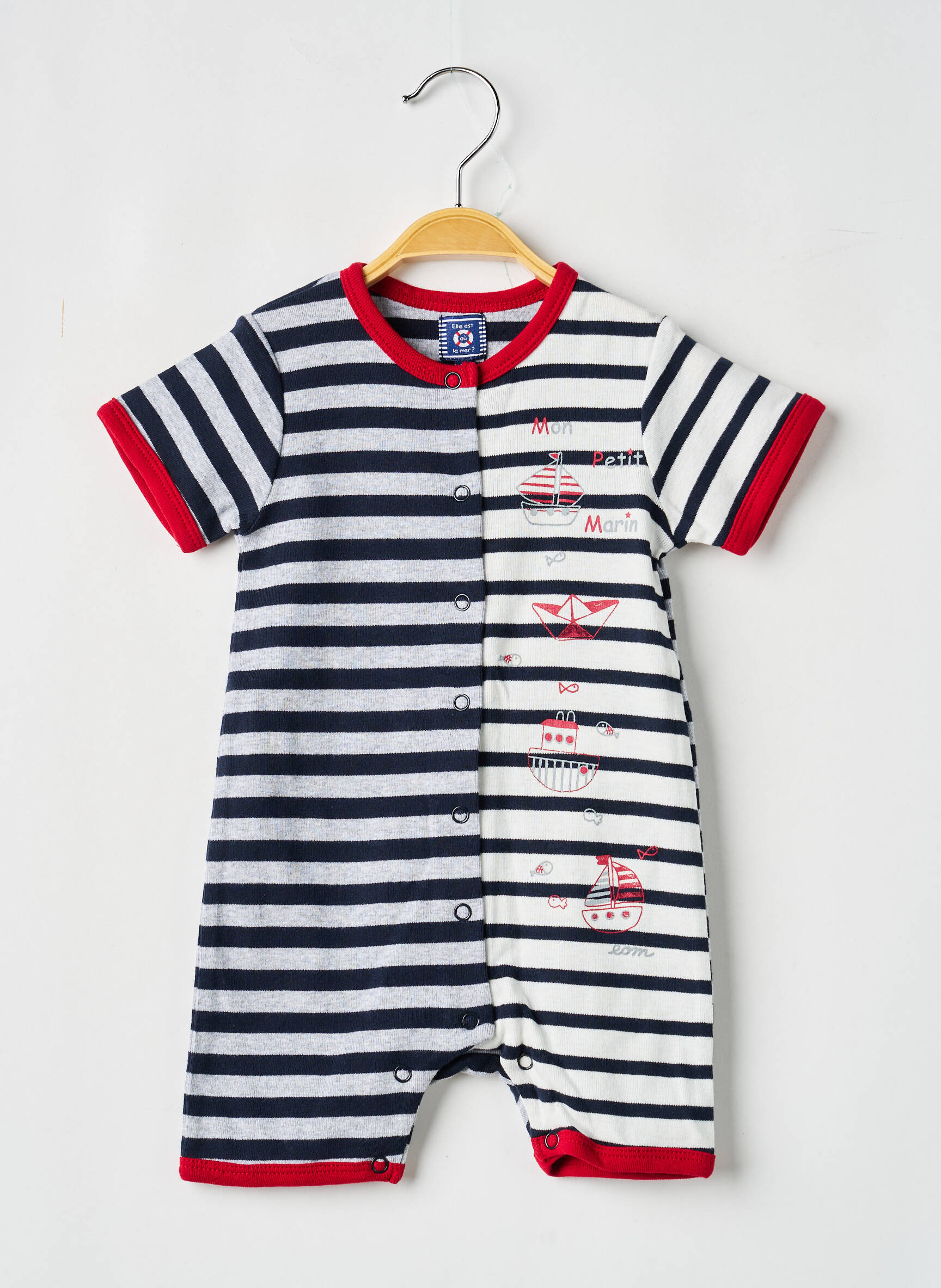 Ce combi-pantalon garçon de la marque ELLE EST OU LA MER est une véritable affaire à ne pas manquer pour offrir à votre enfant un look marin adorable et tendance à petit prix. Avec ses jolies rayures bleu marine et blanches relevées de touches rouges sur les manches, le col et le bas, ce modèle séduit par ses motifs de bateaux et de papiers pliés, parfaits pour une escapade en bord de mer. Pratique avec sa fermeture pressionnée sur toute la longueur, il allie style, confort et économies, idéal pour habiller votre petit garçon sans vous ruiner.