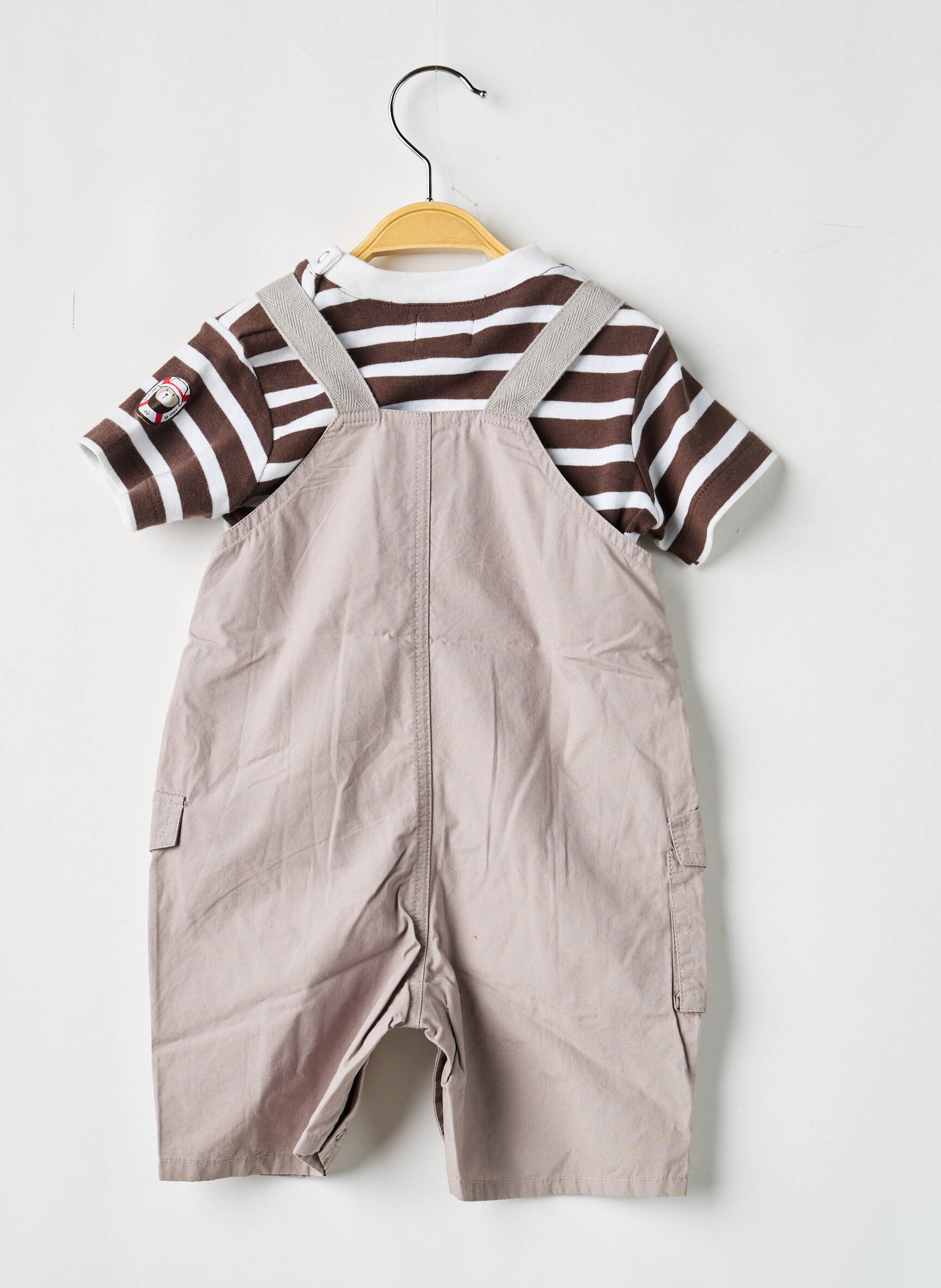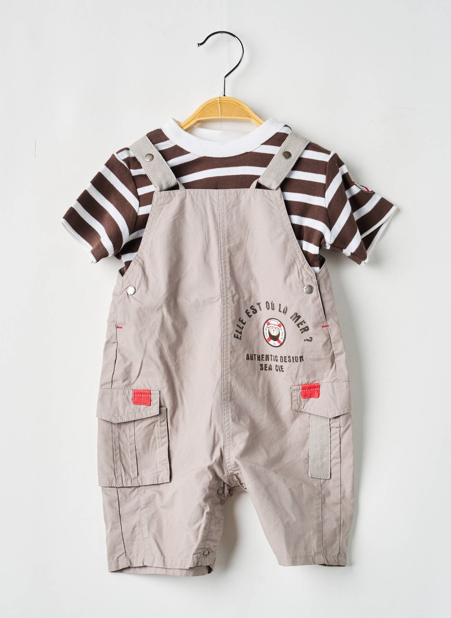 Faites des économies tout en habillant votre garçon avec style grâce à cet ensemble pantalon ELLE EST OU LA MER, composé d’un t-shirt à rayures marron et blanc et d’une salopette pratique beige, décorée de poches et de détails originaux pour un look à la fois décontracté et moderne. Ce bon plan mode combine confort et allure, parfait pour les petits aventuriers à prix malin.