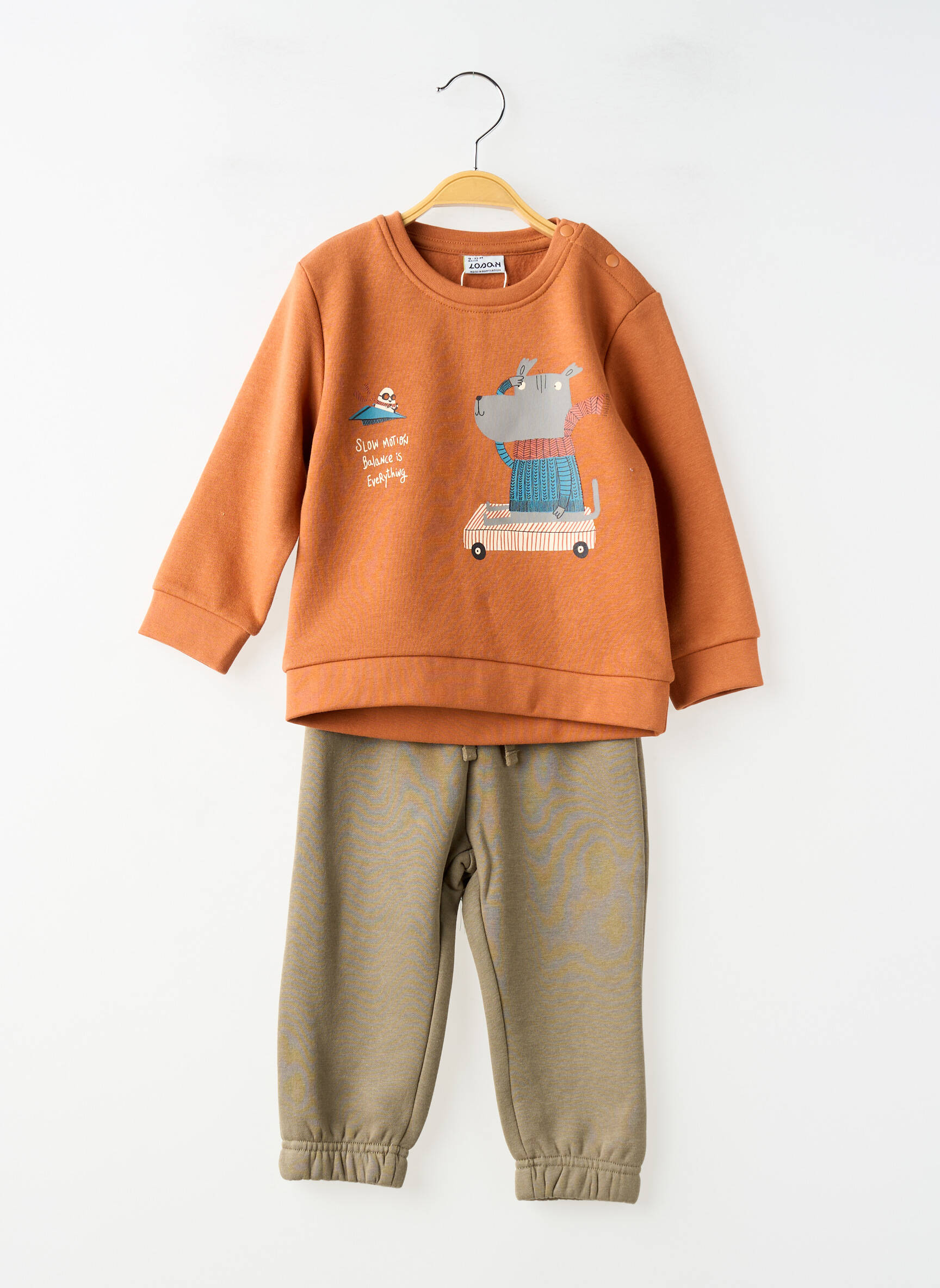 Profitez d’une super affaire avec cet ensemble pantalon pour garçon signé LOSAN, parfait pour habiller votre enfant à petit prix sans compromis sur le style. Le sweat d’un joli ton cuivré, orné d’un motif ludique représentant un animal sur une trottinette, apporte une touche joyeuse et tendance, tandis que le pantalon à la teinte douce complète ce look confortable pour tous les jours. Cet ensemble pratique et chaleureux conviendra aussi bien pour la maison que pour les sorties, idéal pour allier économie et plaisir de la mode enfantine.
