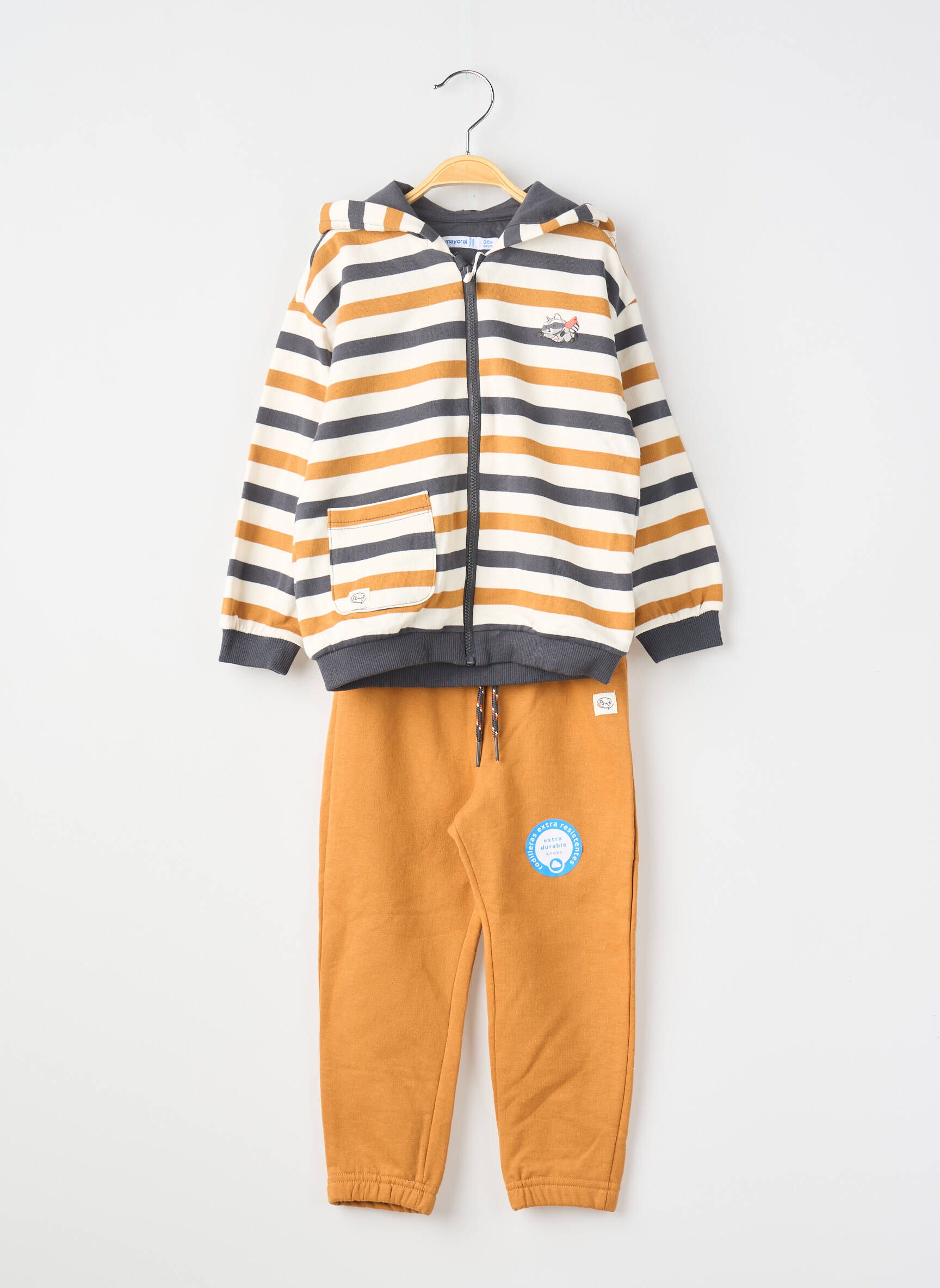 Profitez d’un vrai bon plan avec cet ensemble pantalon pour garçon de la marque Mayoral, parfait pour allier style et confort à petit prix. Le haut à capuche zippé séduit par ses larges rayures tendance dans les tons orange, gris et blanc, tandis que le pantalon uni, rehaussé de motifs originaux, apporte une touche urbaine et décontractée. C’est l’option idéale pour habiller votre enfant avec goût sans vous ruiner, tout en misant sur la qualité d’une marque reconnue.