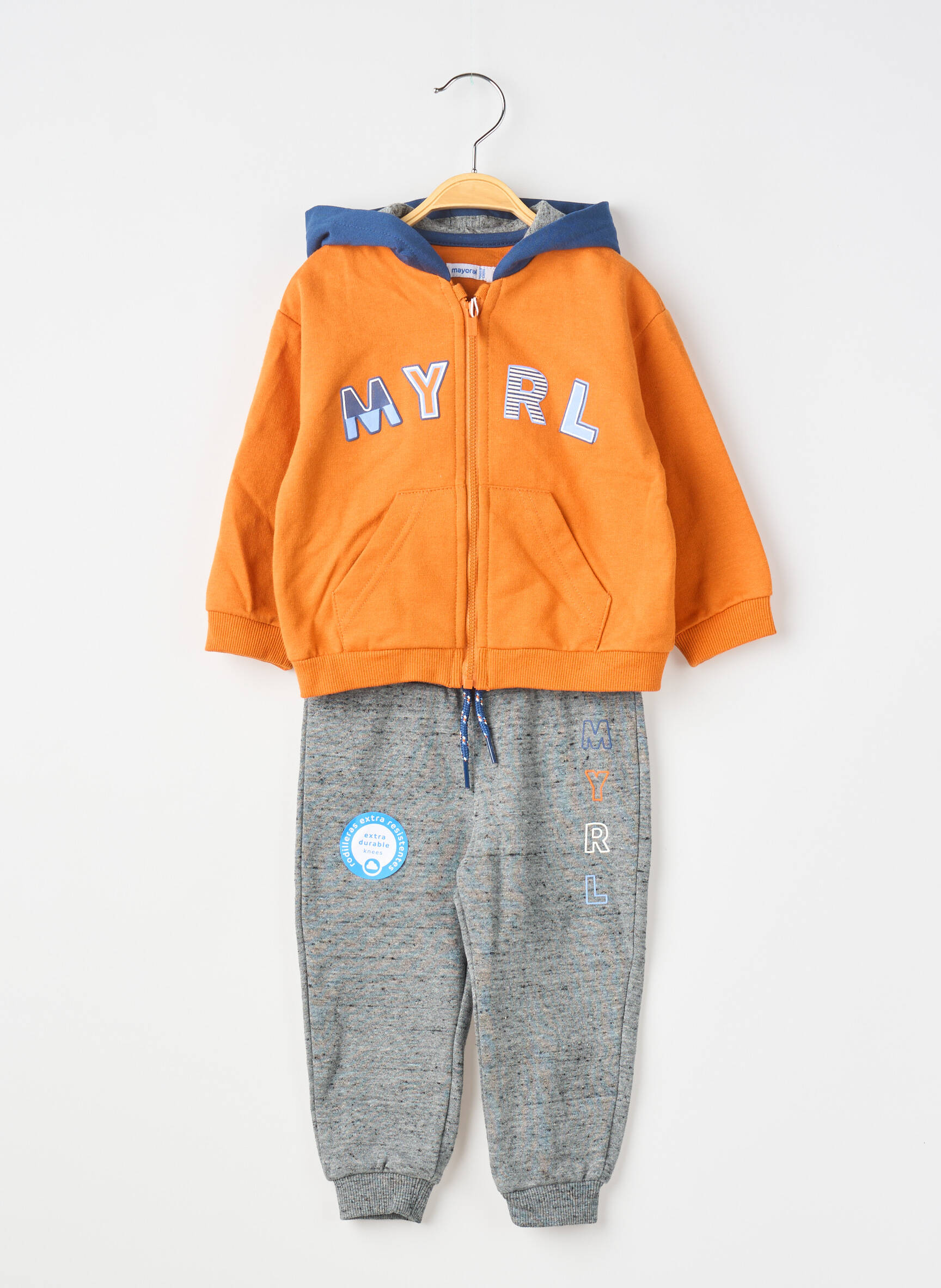 Profitez d’un bon plan à prix mini avec cet ensemble pantalon pour garçon signé Mayoral, parfait pour des journées actives en toute simplicité. Ce modèle associe une veste à capuche orange vif ornée de lettres contrastées avec un pantalon bleu confortable doté d’un écusson discret, pour un look moderne et décontracté, sans compromettre votre budget.